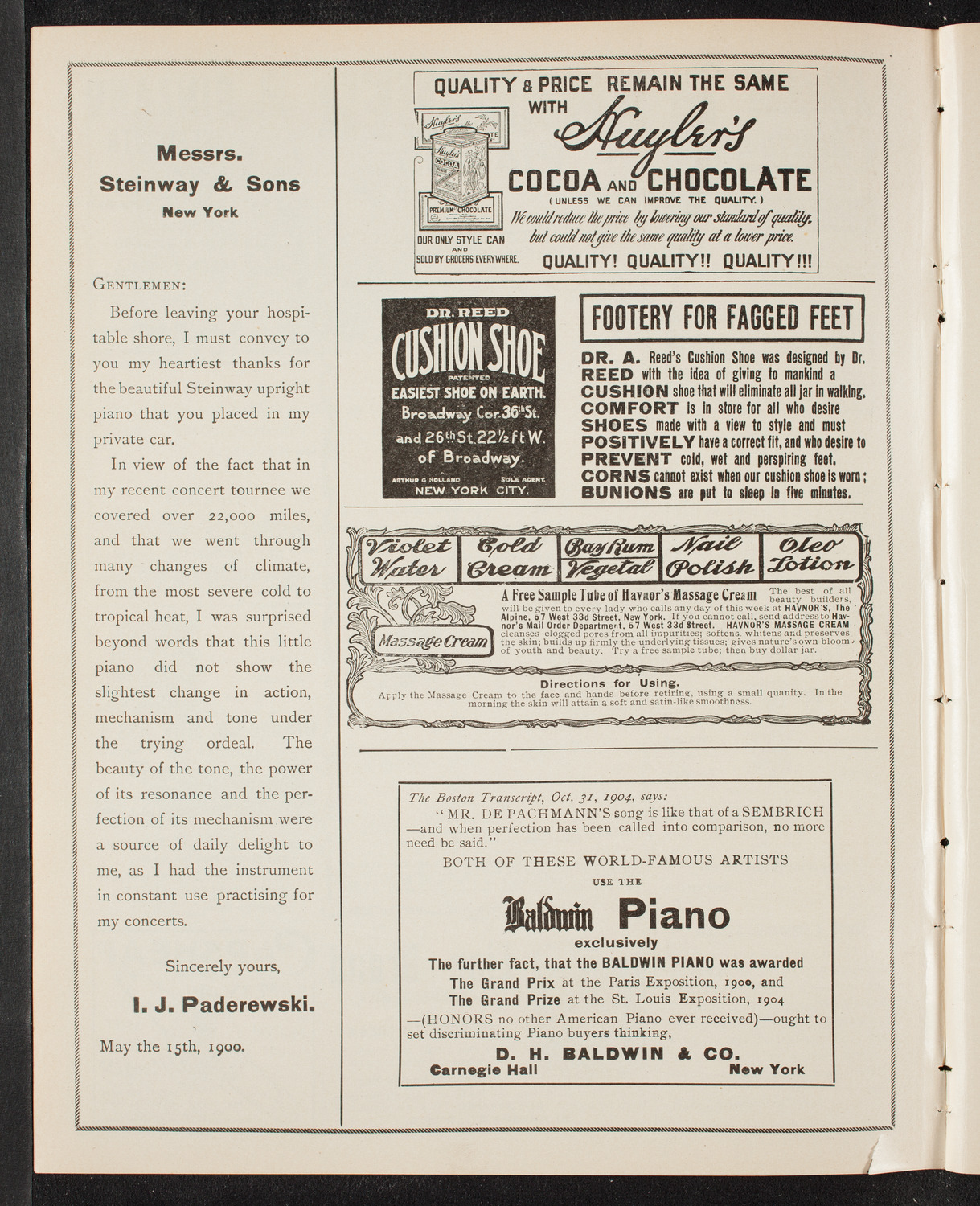Conceptually similarAmicitia Amateur Band, June 4, 1905, program page 1 Amicitia Amateur Band, June 4, 1905, program page 5 Amicitia Amateur Band, June 4, 1905, program page 9 Amicitia Amateur Band, June 4, 1905, program page 10 Amicitia Amateur Band, June 4, 1905, program page 11 Amicitia Amateur Band, June 4, 1905, program page 2 Amicitia Amateur Band, June 4, 1905, program page 3 Amicitia Amateur Band, June 4, 1905, program page 8 Amicitia Amateur Band, June 4, 1905, program page 6 View MoreYour right to access the Digital Collections is subject to these Terms and Conditions.CH163813 Amicitia Amateur Band, June 4, 1905, program page 4Stated time is approximate. CONTENT TYPE: program pageSEASON: 1904-1905Date: June 4, 1905 YEAR: 1905 Credit: Courtesy of Carnegie Hall Archives Source name: Carnegie Hall Rose ArchivesDepartment: Rose Museum and ArchivesCollection: Programs CollectionPlace: New York, NY LANGUAGE: English Size: 3744px × 4608px (~49 MB) RIGHTS STATEMENT: NO COPYRIGHT - UNITED STATESCarnegie Hall believes that this item is in the public domain under the laws of the United States, but a determination was not made as to its copyright status under the copyright laws of other countries. The item may not be in the public domain under the laws of other countries. Read full Rights StatementThough not required, if you want to credit us as the source, please use the statement "Courtesy of Carnegie Hall Rose Archives" and provide a link back to the item on our Digital Collections site. Doing so helps us track how our collection is used and helps justify freely releasing even more content in the future. Sunday, June 4, 1905 at 8:00PM SEASON: 1904-1905VENUE: Main HallDownloadRelated materials: View MorePDFComplete program of Amicitia Amateur Band, June 4, 1905 Amicitia Amateur Band, June 4, 1905, program page 12 Amicitia Amateur Band, June 4, 1905, program page 11 Amicitia Amateur Band, June 4, 1905, program page 10 Amicitia Amateur Band, June 4, 1905, program page 9 Amicitia Amateur Band, June 4, 1905, program page 8 RELATED: Carnegie Hall Programs