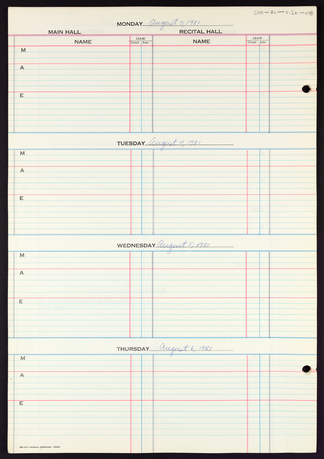 Conceptually similarCarnegie Hall Booking Ledger, volume 26, page 55 Carnegie Hall Booking Ledger, volume 26, page 82 Carnegie Hall Booking Ledger, volume 26, page 82a Carnegie Hall Booking Ledger, volume 26, page 60 Carnegie Hall Booking Ledger, volume 26, page 20 Carnegie Hall Booking Ledger, volume 26, page 54a Carnegie Hall Booking Ledger, volume 26, page 47 Carnegie Hall Booking Ledger, volume 26, page 87 Carnegie Hall Booking Ledger, volume 26, page 100 View MoreYour right to access the Digital Collections is subject to these Terms and Conditions.CH1303197 Carnegie Hall Booking Ledger, volume 26, page 98CONTENT TYPE: booking ledger pageSEASON: 1980-1981Date: August 3, 1981 1981/08/03 to 1981/08/06 YEAR: 1981 Credit: Courtesy of Carnegie Hall Archives Source name: Carnegie Hall Rose ArchivesDepartment: Rose Museum and ArchivesCollection: Booking CollectionPlace: New York, NY Size: 6569px × 9304px (~174 MB) Archives Unique ID: CHA-BL-V26_098 RIGHTS STATEMENT: NO COPYRIGHT - UNITED STATESCarnegie Hall believes that this item is in the public domain under the laws of the United States, but a determination was not made as to its copyright status under the copyright laws of other countries. The item may not be in the public domain under the laws of other countries. Read full Rights StatementThough not required, if you want to credit us as the source, please use the statement "Courtesy of Carnegie Hall Rose Archives" and provide a link back to the item on our Digital Collections site. Doing so helps us track how our collection is used and helps justify freely releasing even more content in the future. DownloadRelated materials: View MorePDFCarnegie Hall Booking Ledger, volume 26 Carnegie Hall Booking Ledger, volume 26, page 3 Carnegie Hall Booking Ledger, volume 26, page 2a Carnegie Hall Booking Ledger, volume 26, page 2 Carnegie Hall Booking Ledger, volume 26, page 1 Carnegie Hall Booking Ledger, volume 26, page 106 RELATED: Carnegie Hall Booking Ledgers