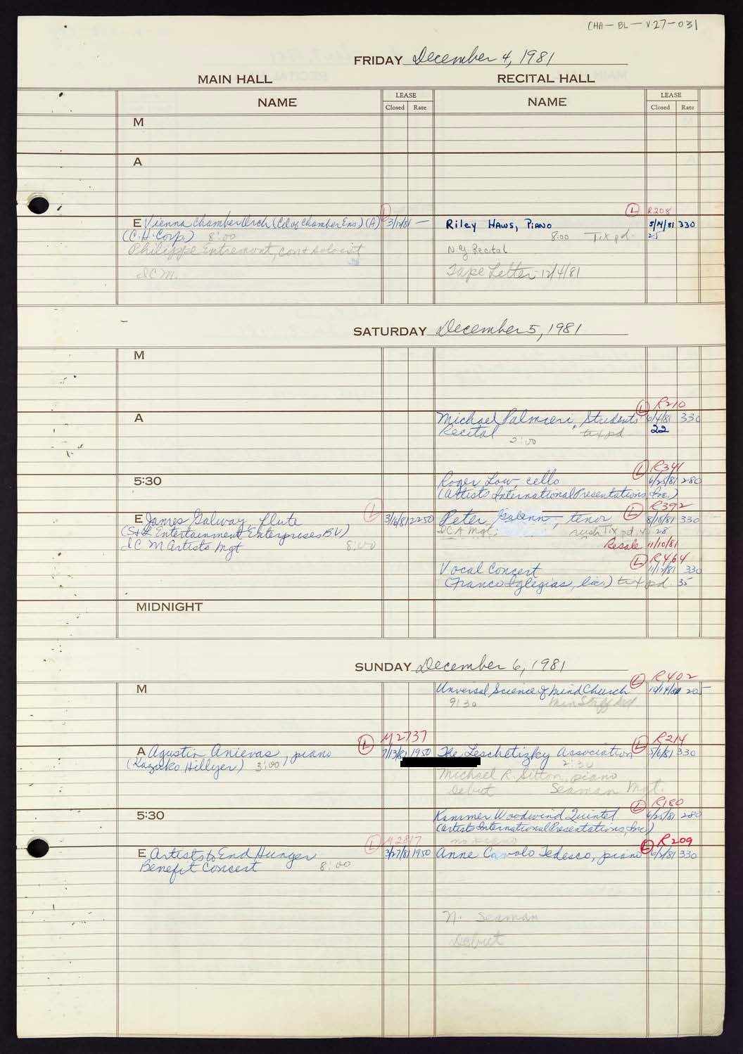 Conceptually similarCarnegie Hall Booking Ledger, volume 27, page 83 Carnegie Hall Booking Ledger, volume 27, page 89 Carnegie Hall Booking Ledger, volume 27, page 68 Carnegie Hall Booking Ledger, volume 27, page 65 Carnegie Hall Booking Ledger, volume 27, page 37 Carnegie Hall Booking Ledger, volume 27, page 85 Carnegie Hall Booking Ledger, volume 27, page 87 Carnegie Hall Booking Ledger, volume 27, page 86 Carnegie Hall Booking Ledger, volume 27, page 70 View MoreYour right to access the Digital Collections is subject to these Terms and Conditions.CH1303249 Carnegie Hall Booking Ledger, volume 27, page 31CONTENT TYPE: booking ledger pageSEASON: 1981-1982Date: December 4, 1981 1981/12/04 to 1981/12/06 YEAR: 1981 Credit: Courtesy of Carnegie Hall Archives Source name: Carnegie Hall Rose ArchivesDepartment: Rose Museum and ArchivesCollection: Booking CollectionPlace: New York, NY Tags: redactionSize: 1056px × 1499px (~4 MB) Archives Unique ID: CHA-BL-V27_031 RIGHTS STATEMENT: NO COPYRIGHT - UNITED STATESCarnegie Hall believes that this item is in the public domain under the laws of the United States, but a determination was not made as to its copyright status under the copyright laws of other countries. The item may not be in the public domain under the laws of other countries. Read full Rights StatementThough not required, if you want to credit us as the source, please use the statement "Courtesy of Carnegie Hall Rose Archives" and provide a link back to the item on our Digital Collections site. Doing so helps us track how our collection is used and helps justify freely releasing even more content in the future. DownloadRelated materials: View MorePDFCarnegie Hall Booking Ledger, volume 27 Carnegie Hall Booking Ledger, volume 27, page 4 Carnegie Hall Booking Ledger, volume 27, page 3 Carnegie Hall Booking Ledger, volume 27, page 2 Carnegie Hall Booking Ledger, volume 27, page 1 Carnegie Hall Booking Ledger, volume 27, page 108 RELATED: Carnegie Hall Booking Ledgers