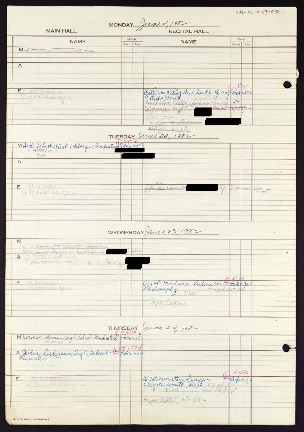 Conceptually similarCarnegie Hall Booking Ledger, volume 27, page 88a Carnegie Hall Booking Ledger, volume 27, page 10 Carnegie Hall Booking Ledger, volume 27, page 89 Carnegie Hall Booking Ledger, volume 27, page 36 Carnegie Hall Booking Ledger, volume 27, page 83 Carnegie Hall Booking Ledger, volume 27, page 61 Carnegie Hall Booking Ledger, volume 27, page 23 Carnegie Hall Booking Ledger, volume 27, page 31 Carnegie Hall Booking Ledger, volume 27, page 85 View MoreYour right to access the Digital Collections is subject to these Terms and Conditions.CH1303331 Carnegie Hall Booking Ledger, volume 27, page 88CONTENT TYPE: booking ledger pageSEASON: 1981-1982Date: June 21, 1982 1982/06/21 to 1982/06/24 YEAR: 1982 Credit: Courtesy of Carnegie Hall Archives Source name: Carnegie Hall Rose ArchivesDepartment: Rose Museum and ArchivesCollection: Booking CollectionPlace: New York, NY Tags: redactionSize: 1056px × 1499px (~4 MB) Archives Unique ID: CHA-BL-V27_088 RIGHTS STATEMENT: NO COPYRIGHT - UNITED STATESCarnegie Hall believes that this item is in the public domain under the laws of the United States, but a determination was not made as to its copyright status under the copyright laws of other countries. The item may not be in the public domain under the laws of other countries. Read full Rights StatementThough not required, if you want to credit us as the source, please use the statement "Courtesy of Carnegie Hall Rose Archives" and provide a link back to the item on our Digital Collections site. Doing so helps us track how our collection is used and helps justify freely releasing even more content in the future. DownloadRelated materials: View MorePDFCarnegie Hall Booking Ledger, volume 27 Carnegie Hall Booking Ledger, volume 27, page 4 Carnegie Hall Booking Ledger, volume 27, page 3 Carnegie Hall Booking Ledger, volume 27, page 2 Carnegie Hall Booking Ledger, volume 27, page 1 Carnegie Hall Booking Ledger, volume 27, page 108 RELATED: Carnegie Hall Booking Ledgers