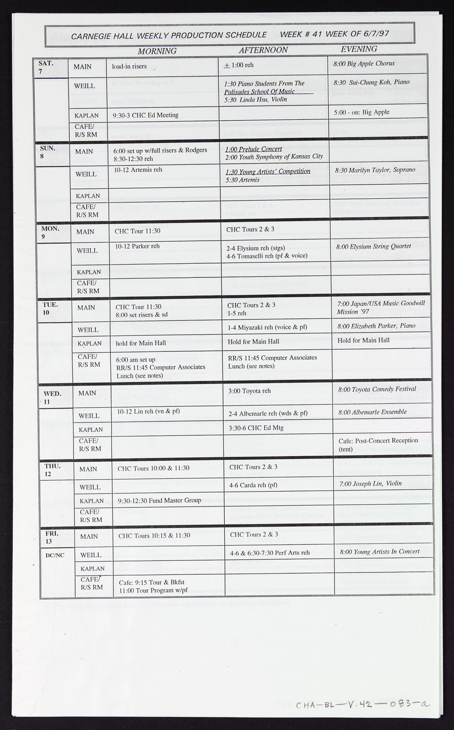 Conceptually similarCarnegie Hall Booking Ledger, volume 42, page 83 Carnegie Hall Booking Ledger, volume 42, page 31a Carnegie Hall Booking Ledger, volume 41, page 83a Carnegie Hall Booking Ledger, volume 42, page 85 Carnegie Hall Booking Ledger, volume 42, page 91 Carnegie Hall Booking Ledger, volume 42, page 81a Carnegie Hall Booking Ledger, volume 43, page 83a Carnegie Hall Booking Ledger, volume 42, page 91a Carnegie Hall Booking Ledger, volume 48, page 83a View MoreYour right to access the Digital Collections is subject to these Terms and Conditions.CH1305619 Carnegie Hall Booking Ledger, volume 42, page 83aCONTENT TYPE: booking ledger pageSEASON: 1996-1997Date: June 7, 1997 1997/06/07 to 1997/06/13 YEAR: 1997 Credit: Courtesy of Carnegie Hall Archives Source name: Carnegie Hall Rose ArchivesDepartment: Rose Museum and ArchivesCollection: Booking CollectionPlace: New York, NY Size: 4288px × 6892px (~84 MB) Archives Unique ID: CHA-BL-V42_083_a RIGHTS STATEMENT: NO COPYRIGHT - UNITED STATESCarnegie Hall believes that this item is in the public domain under the laws of the United States, but a determination was not made as to its copyright status under the copyright laws of other countries. The item may not be in the public domain under the laws of other countries. Read full Rights StatementThough not required, if you want to credit us as the source, please use the statement "Courtesy of Carnegie Hall Rose Archives" and provide a link back to the item on our Digital Collections site. Doing so helps us track how our collection is used and helps justify freely releasing even more content in the future. DownloadRelated materials: View MorePDFCarnegie Hall Booking Ledger, volume 42 Carnegie Hall Booking Ledger, volume 42, page 3 Carnegie Hall Booking Ledger, volume 42, page 2 Carnegie Hall Booking Ledger, volume 42, page 1 Carnegie Hall Booking Ledger, volume 42, page 108 Carnegie Hall Booking Ledger, volume 42, page 107 RELATED: Carnegie Hall Booking Ledgers