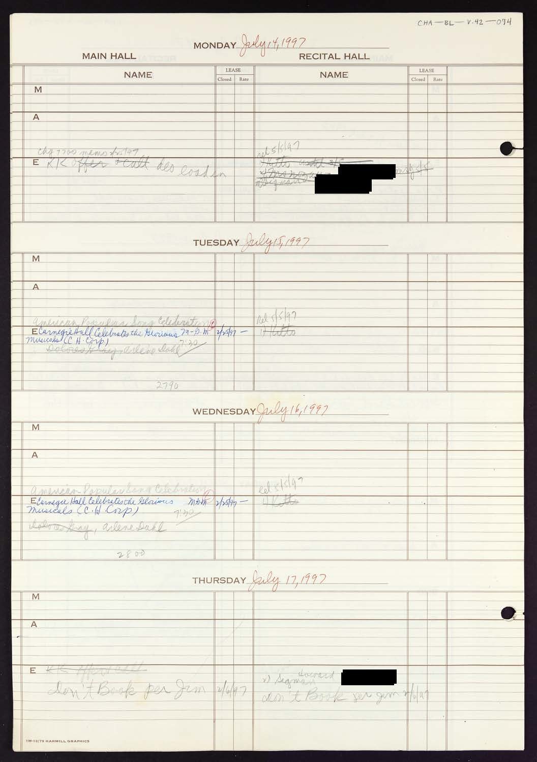 Conceptually similarCarnegie Hall Booking Ledger, volume 42, page 16 Carnegie Hall Booking Ledger, volume 42, page 91 Carnegie Hall Booking Ledger, volume 42, page 68 Carnegie Hall Booking Ledger, volume 42, page 66 Carnegie Hall Booking Ledger, volume 42, page 60 Carnegie Hall Booking Ledger, volume 42, page 25 Carnegie Hall Booking Ledger, volume 42, page 93 Carnegie Hall Booking Ledger, volume 42, page 92 Carnegie Hall Booking Ledger, volume 42, page 42 View MoreYour right to access the Digital Collections is subject to these Terms and Conditions.CH1305633 Carnegie Hall Booking Ledger, volume 42, page 94CONTENT TYPE: booking ledger pageSEASON: 1996-1997Date: July 14, 1997 1997/07/14 to 1997/07/17 YEAR: 1997 Credit: Courtesy of Carnegie Hall Archives Source name: Carnegie Hall Rose ArchivesDepartment: Rose Museum and ArchivesCollection: Booking CollectionPlace: New York, NY Tags: redactionSize: 1056px × 1499px (~4 MB) Archives Unique ID: CHA-BL-V42_094 RIGHTS STATEMENT: NO COPYRIGHT - UNITED STATESCarnegie Hall believes that this item is in the public domain under the laws of the United States, but a determination was not made as to its copyright status under the copyright laws of other countries. The item may not be in the public domain under the laws of other countries. Read full Rights StatementThough not required, if you want to credit us as the source, please use the statement "Courtesy of Carnegie Hall Rose Archives" and provide a link back to the item on our Digital Collections site. Doing so helps us track how our collection is used and helps justify freely releasing even more content in the future. DownloadRelated materials: View MorePDFCarnegie Hall Booking Ledger, volume 42 Carnegie Hall Booking Ledger, volume 42, page 3 Carnegie Hall Booking Ledger, volume 42, page 2 Carnegie Hall Booking Ledger, volume 42, page 1 Carnegie Hall Booking Ledger, volume 42, page 108 Carnegie Hall Booking Ledger, volume 42, page 107 RELATED: Carnegie Hall Booking Ledgers