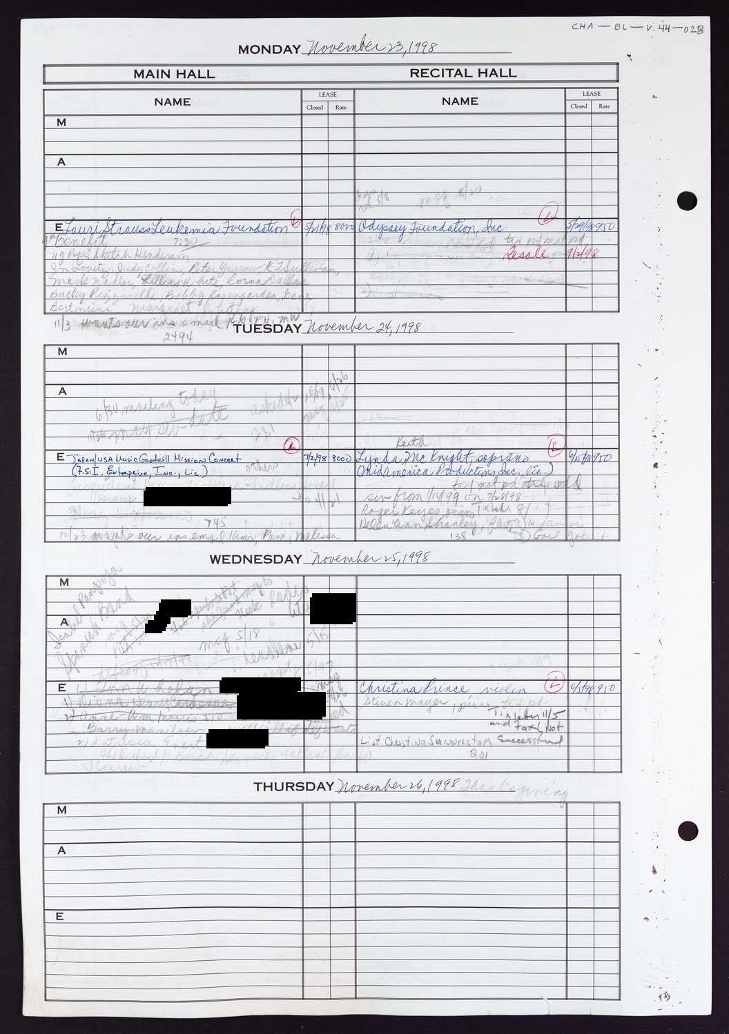 Conceptually similarCarnegie Hall Booking Ledger, volume 44, page 23 Carnegie Hall Booking Ledger, volume 44, page 79 Carnegie Hall Booking Ledger, volume 44, page 15 Carnegie Hall Booking Ledger, volume 44, page 29 Carnegie Hall Booking Ledger, volume 44, page 26 Carnegie Hall Booking Ledger, volume 44, page 22 Carnegie Hall Booking Ledger, volume 44, page 106 Carnegie Hall Booking Ledger, volume 44, page 19 Carnegie Hall Booking Ledger, volume 44, page 72 View MoreYour right to access the Digital Collections is subject to these Terms and Conditions.CH1305832 Carnegie Hall Booking Ledger, volume 44, page 28CONTENT TYPE: booking ledger pageSEASON: 1998-1999Date: November 23, 1998 1998/11/23 to 1998/11/26 YEAR: 1998 Credit: Courtesy of Carnegie Hall Archives Source name: Carnegie Hall Rose ArchivesDepartment: Rose Museum and ArchivesCollection: Booking CollectionPlace: New York, NY Tags: redactionSize: 1056px × 1499px (~4 MB) Archives Unique ID: CHA-BL-V44_028 RIGHTS STATEMENT: NO COPYRIGHT - UNITED STATESCarnegie Hall believes that this item is in the public domain under the laws of the United States, but a determination was not made as to its copyright status under the copyright laws of other countries. The item may not be in the public domain under the laws of other countries. Read full Rights StatementThough not required, if you want to credit us as the source, please use the statement "Courtesy of Carnegie Hall Rose Archives" and provide a link back to the item on our Digital Collections site. Doing so helps us track how our collection is used and helps justify freely releasing even more content in the future. DownloadRelated materials: View MorePDFCarnegie Hall Booking Ledger, volume 44 Carnegie Hall Booking Ledger, volume 44, page 5a Carnegie Hall Booking Ledger, volume 44, page 5 Carnegie Hall Booking Ledger, volume 44, page 4 Carnegie Hall Booking Ledger, volume 44, page 3 Carnegie Hall Booking Ledger, volume 44, page 2 RELATED: Carnegie Hall Booking Ledgers