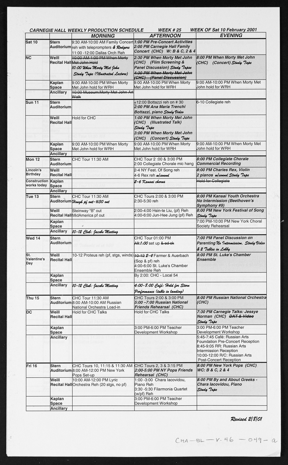 Conceptually similarCarnegie Hall Booking Ledger, volume 46, page 49 Carnegie Hall Booking Ledger, volume 46, page 51 Carnegie Hall Booking Ledger, volume 46, page 57a Carnegie Hall Booking Ledger, volume 45, page 49a Carnegie Hall Booking Ledger, volume 41, page 49a Carnegie Hall Booking Ledger, volume 46, page 51a Carnegie Hall Booking Ledger, volume 46, page 53a Carnegie Hall Booking Ledger, volume 46, page 15a Carnegie Hall Booking Ledger, volume 46, page 16 View MoreYour right to access the Digital Collections is subject to these Terms and Conditions.CH1306152 Carnegie Hall Booking Ledger, volume 46, page 49aCONTENT TYPE: booking ledger pageSEASON: 2000-2001Date: February 10, 2001 2001/02/10 to 2001/02/16 YEAR: 2001 Credit: Courtesy of Carnegie Hall Archives Source name: Carnegie Hall Rose ArchivesDepartment: Rose Museum and ArchivesCollection: Booking CollectionPlace: New York, NY Size: 4269px × 6895px (~84 MB) Archives Unique ID: CHA-BL-V46_049_a RIGHTS STATEMENT: NO COPYRIGHT - UNITED STATESCarnegie Hall believes that this item is in the public domain under the laws of the United States, but a determination was not made as to its copyright status under the copyright laws of other countries. The item may not be in the public domain under the laws of other countries. Read full Rights StatementThough not required, if you want to credit us as the source, please use the statement "Courtesy of Carnegie Hall Rose Archives" and provide a link back to the item on our Digital Collections site. Doing so helps us track how our collection is used and helps justify freely releasing even more content in the future. DownloadRelated materials: View MorePDFCarnegie Hall Booking Ledger, volume 46 Carnegie Hall Booking Ledger, volume 46, page 7 Carnegie Hall Booking Ledger, volume 46, page 6 Carnegie Hall Booking Ledger, volume 46, page 5a Carnegie Hall Booking Ledger, volume 46, page 5 Carnegie Hall Booking Ledger, volume 46, page 4 RELATED: Carnegie Hall Booking Ledgers
