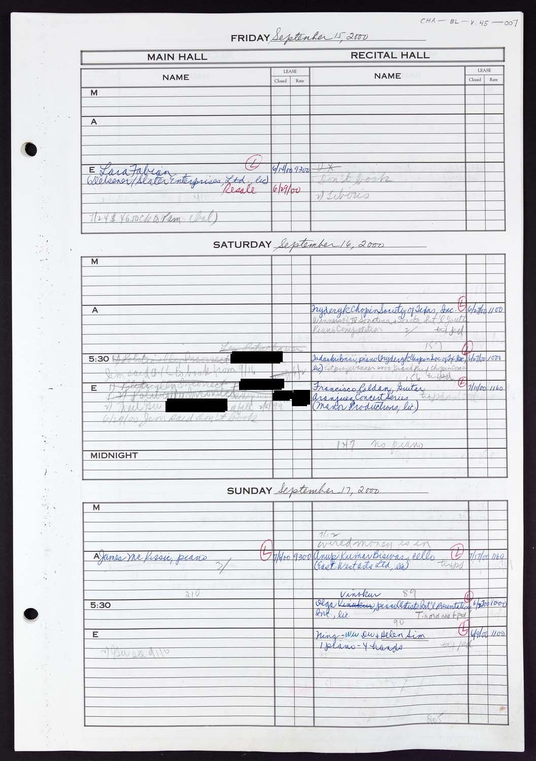 Conceptually similarCarnegie Hall Booking Ledger, volume 46, page 8 Carnegie Hall Booking Ledger, volume 46, page 9 Carnegie Hall Booking Ledger, volume 46, page 6 Carnegie Hall Booking Ledger, volume 46, page 85 Carnegie Hall Booking Ledger, volume 46, page 10 Carnegie Hall Booking Ledger, volume 46, page 5 Carnegie Hall Booking Ledger, volume 46, page 66 Carnegie Hall Booking Ledger, volume 46, page 49 Carnegie Hall Booking Ledger, volume 46, page 25 View MoreYour right to access the Digital Collections is subject to these Terms and Conditions.CH1306238 Carnegie Hall Booking Ledger, volume 46, page 7CONTENT TYPE: booking ledger pageSEASON: 2000-2001Date: September 15, 2000 2000/09/15 to 2000/09/17 YEAR: 2000 Credit: Courtesy of Carnegie Hall Archives Source name: Carnegie Hall Rose ArchivesDepartment: Rose Museum and ArchivesCollection: Booking CollectionPlace: New York, NY Tags: redactionSize: 1056px × 1499px (~4 MB) Archives Unique ID: CHA-BL-V46_007 RIGHTS STATEMENT: NO COPYRIGHT - UNITED STATESCarnegie Hall believes that this item is in the public domain under the laws of the United States, but a determination was not made as to its copyright status under the copyright laws of other countries. The item may not be in the public domain under the laws of other countries. Read full Rights StatementThough not required, if you want to credit us as the source, please use the statement "Courtesy of Carnegie Hall Rose Archives" and provide a link back to the item on our Digital Collections site. Doing so helps us track how our collection is used and helps justify freely releasing even more content in the future. DownloadRelated materials: View MorePDFCarnegie Hall Booking Ledger, volume 46 Carnegie Hall Booking Ledger, volume 46, page 6 Carnegie Hall Booking Ledger, volume 46, page 5a Carnegie Hall Booking Ledger, volume 46, page 5 Carnegie Hall Booking Ledger, volume 46, page 4 RELATED: Carnegie Hall Booking Ledgers