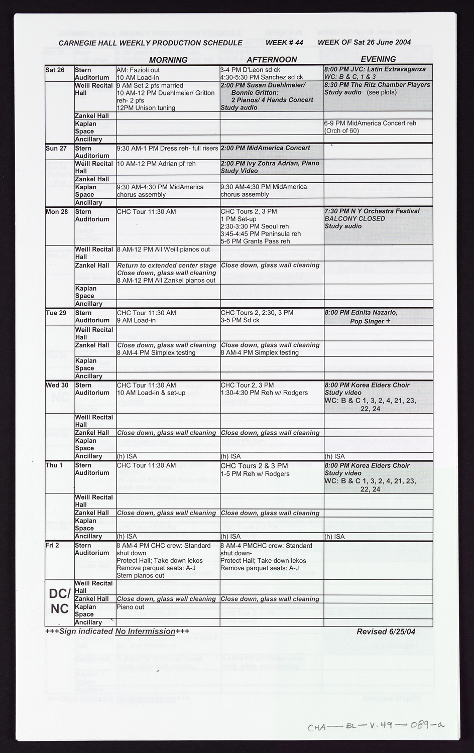 Conceptually similarCarnegie Hall Booking Ledger, volume 49, page 89 Carnegie Hall Booking Ledger, volume 44, page 89a Carnegie Hall Booking Ledger, volume 38, page 89a Carnegie Hall Booking Ledger, volume 48, page 89a Carnegie Hall Booking Ledger, volume 49, page 49a Carnegie Hall Booking Ledger, volume 50, page 89a Carnegie Hall Booking Ledger, volume 49, page 99a Carnegie Hall Booking Ledger, volume 49, page 49 Carnegie Hall Booking Ledger, volume 49, page 54 View MoreYour right to access the Digital Collections is subject to these Terms and Conditions.CH1306668 Carnegie Hall Booking Ledger, volume 49, page 89aCONTENT TYPE: booking ledger pageSEASON: 2003-2004Date: June 26, 2004 2004/06/26 to 2004/07/02 YEAR: 2004 Credit: Courtesy of Carnegie Hall Archives Source name: Carnegie Hall Rose ArchivesDepartment: Rose Museum and ArchivesCollection: Booking CollectionPlace: New York, NY Size: 3896px × 6192px (~69 MB) Archives Unique ID: CHA-BL-V49_089_a RIGHTS STATEMENT: NO COPYRIGHT - UNITED STATESCarnegie Hall believes that this item is in the public domain under the laws of the United States, but a determination was not made as to its copyright status under the copyright laws of other countries. The item may not be in the public domain under the laws of other countries. Read full Rights StatementThough not required, if you want to credit us as the source, please use the statement "Courtesy of Carnegie Hall Rose Archives" and provide a link back to the item on our Digital Collections site. Doing so helps us track how our collection is used and helps justify freely releasing even more content in the future. DownloadRelated materials: View MorePDFCarnegie Hall Booking Ledger, volume 49 Carnegie Hall Booking Ledger, volume 49, page 5a Carnegie Hall Booking Ledger, volume 49, page 5 Carnegie Hall Booking Ledger, volume 49, page 4 Carnegie Hall Booking Ledger, volume 49, page 3a Carnegie Hall Booking Ledger, volume 49, page 3 RELATED: Carnegie Hall Booking Ledgers