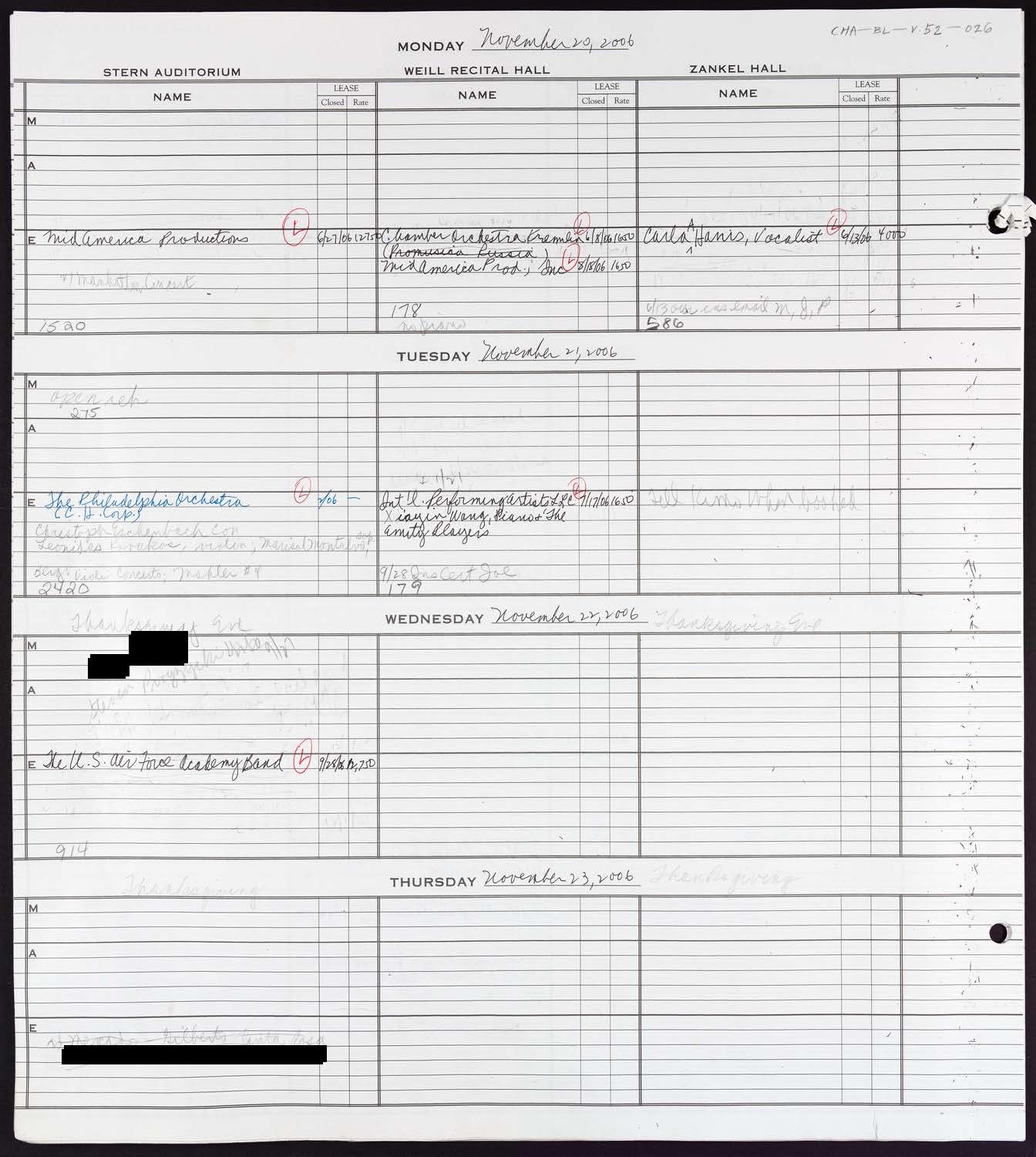 Conceptually similarCarnegie Hall Booking Ledger, volume 52, page 28 Carnegie Hall Booking Ledger, volume 52, page 22 Carnegie Hall Booking Ledger, volume 52, page 24 Carnegie Hall Booking Ledger, volume 52, page 27 Carnegie Hall Booking Ledger, volume 52, page 104 Carnegie Hall Booking Ledger, volume 52, page 18 Carnegie Hall Booking Ledger, volume 52, page 69 Carnegie Hall Booking Ledger, volume 52, page 53 Carnegie Hall Booking Ledger, volume 52, page 6 View MoreYour right to access the Digital Collections is subject to these Terms and Conditions.CH1307046 Carnegie Hall Booking Ledger, volume 52, page 26CONTENT TYPE: booking ledger pageSEASON: 2006-2007Date: November 20, 2006 2006/11/20 to 2006/11/23 YEAR: 2006 Credit: Courtesy of Carnegie Hall Archives Source name: Carnegie Hall Rose ArchivesDepartment: Rose Museum and ArchivesCollection: Booking CollectionPlace: New York, NY Tags: redactionSize: 1344px × 1500px (~5 MB) Archives Unique ID: CHA-BL-V52_026 RIGHTS STATEMENT: NO COPYRIGHT - UNITED STATESCarnegie Hall believes that this item is in the public domain under the laws of the United States, but a determination was not made as to its copyright status under the copyright laws of other countries. The item may not be in the public domain under the laws of other countries. Read full Rights StatementThough not required, if you want to credit us as the source, please use the statement "Courtesy of Carnegie Hall Rose Archives" and provide a link back to the item on our Digital Collections site. Doing so helps us track how our collection is used and helps justify freely releasing even more content in the future. DownloadRelated materials: View MorePDFCarnegie Hall Booking Ledger, volume 52 Carnegie Hall Booking Ledger, volume 52, page 5 Carnegie Hall Booking Ledger, volume 52, page 4 Carnegie Hall Booking Ledger, volume 52, page 3a Carnegie Hall Booking Ledger, volume 52, page 3 Carnegie Hall Booking Ledger, volume 52, page 2 RELATED: Carnegie Hall Booking Ledgers