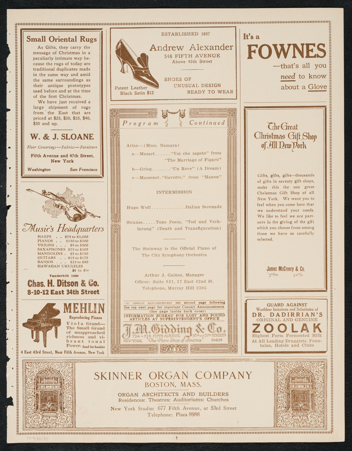 Conceptually similarCity Symphony Orchestra, December 4, 1922, program page 4 City Symphony Orchestra, December 21, 1922, program page 7 City Symphony Orchestra, December 4, 1922, program page 5 City Symphony Orchestra, December 4, 1922, program page 1 City Symphony Orchestra, December 11, 1922, program page 4 City Symphony Orchestra, December 4, 1922, program page 3 City Symphony Orchestra, December 4, 1922, program page 2 City Symphony Orchestra, December 4, 1922, program page 9 City Symphony Orchestra, December 4, 1922, program page 6 View MoreYour right to access the Digital Collections is subject to these Terms and Conditions.CH1166430 City Symphony Orchestra, December 4, 1922, program page 7Manager: Arthur J. Gaines CONTENT TYPE: program pageSEASON: 1922-1923Date: December 4, 1922 YEAR: 1922 Credit: Courtesy of Carnegie Hall Archives Source name: Carnegie Hall Rose ArchivesDepartment: Rose Museum and ArchivesCollection: Programs CollectionPlace: New York, NY LANGUAGE: English Size: 3743px × 4793px (~51 MB) RIGHTS STATEMENT: NO COPYRIGHT - UNITED STATESCarnegie Hall believes that this item is in the public domain under the laws of the United States, but a determination was not made as to its copyright status under the copyright laws of other countries. The item may not be in the public domain under the laws of other countries. Read full Rights StatementThough not required, if you want to credit us as the source, please use the statement "Courtesy of Carnegie Hall Rose Archives" and provide a link back to the item on our Digital Collections site. Doing so helps us track how our collection is used and helps justify freely releasing even more content in the future. Monday, December 4, 1922 at 8:30PM SEASON: 1922-1923VENUE: Main HallDownloadRelated materials: View MorePDFComplete program of City Symphony Orchestra, December 4, 1922 City Symphony Orchestra, December 4, 1922, program page 12 City Symphony Orchestra, December 4, 1922, program page 11 City Symphony Orchestra, December 4, 1922, program page 10 City Symphony Orchestra, December 4, 1922, program page 9 City Symphony Orchestra, December 4, 1922, program page 8 RELATED: Carnegie Hall Programs