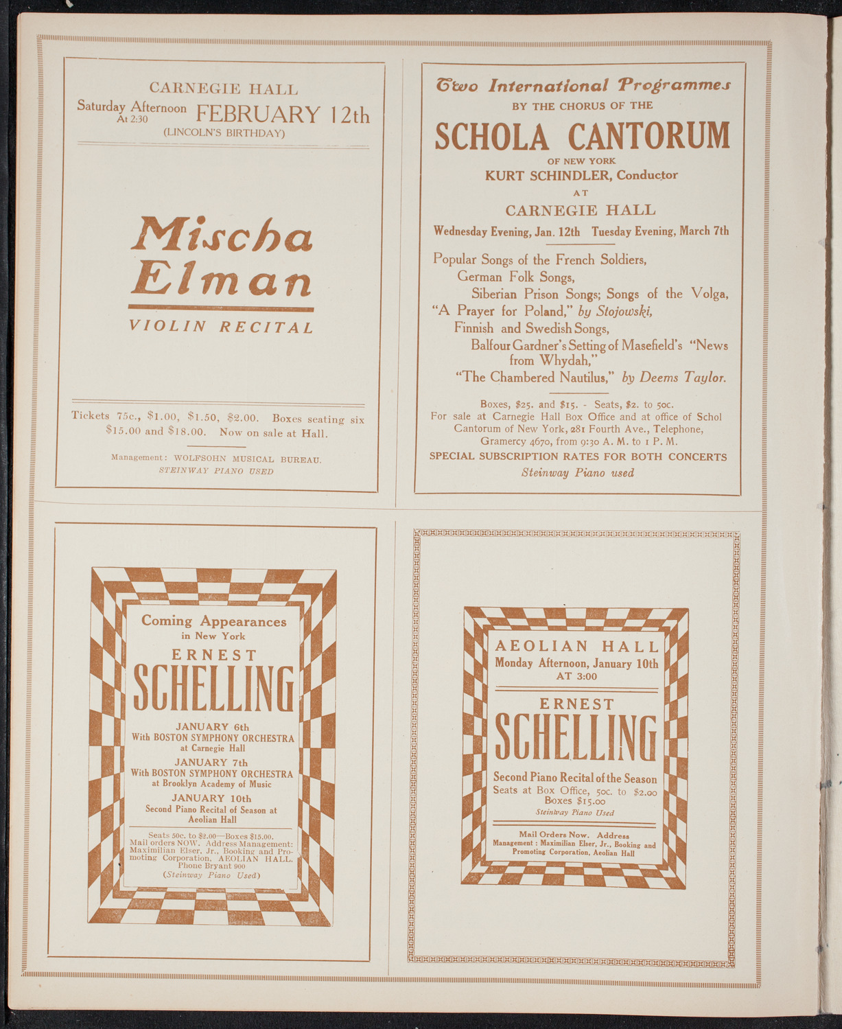 Conceptually similarConcert and Meeting: American Jewish Relief Committee, December 21, 1915, program page 1 Concert and Meeting: American Jewish Relief Committee, December 21, 1915, program page 5 Concert and Meeting: American Jewish Relief Committee, December 21, 1915, program page 8 Concert and Meeting: American Jewish Relief Committee, December 21, 1915, program page 6 Concert and Meeting: American Jewish Relief Committee, December 21, 1915, program page 3 Concert and Meeting: American Jewish Relief Committee, December 21, 1915, program page 9 Concert and Meeting: American Jewish Relief Committee, December 21, 1915, program page 2 Concert and Meeting: American Jewish Relief Committee, December 21, 1915, program page 4 Concert and Meeting: American Jewish Relief Committee, December 21, 1915, program page 7 View MoreYour right to access the Digital Collections is subject to these Terms and Conditions.CH1128686 Concert and Meeting: American Jewish Relief Committee, December 21, 1915, program page 10Benefit for Sufferers from the War CONTENT TYPE: program pageSEASON: 1915-1916Date: December 21, 1915 YEAR: 1915 Credit: Courtesy of Carnegie Hall Archives Source name: Carnegie Hall Rose ArchivesDepartment: Rose Museum and ArchivesCollection: Programs CollectionPlace: New York, NY LANGUAGE: English Size: 3517px × 4298px (~43 MB) RIGHTS STATEMENT: NO COPYRIGHT - UNITED STATESCarnegie Hall believes that this item is in the public domain under the laws of the United States, but a determination was not made as to its copyright status under the copyright laws of other countries. The item may not be in the public domain under the laws of other countries. Read full Rights StatementThough not required, if you want to credit us as the source, please use the statement "Courtesy of Carnegie Hall Rose Archives" and provide a link back to the item on our Digital Collections site. Doing so helps us track how our collection is used and helps justify freely releasing even more content in the future. Tuesday, December 21, 1915 at 8:00PM SEASON: 1915-1916VENUE: Main HallDownloadRelated materials: View MorePDFComplete program of Concert and Meeting: American Jewish Relief Committee, December 21, 1915 Concert and Meeting: American Jewish Relief Committee, December 21, 1915, program page 12 Concert and Meeting: American Jewish Relief Committee, December 21, 1915, program page 11 Concert and Meeting: American Jewish Relief Committee, December 21, 1915, program page 9 Concert and Meeting: American Jewish Relief Committee, December 21, 1915, program page 8 RELATED: Carnegie Hall Programs