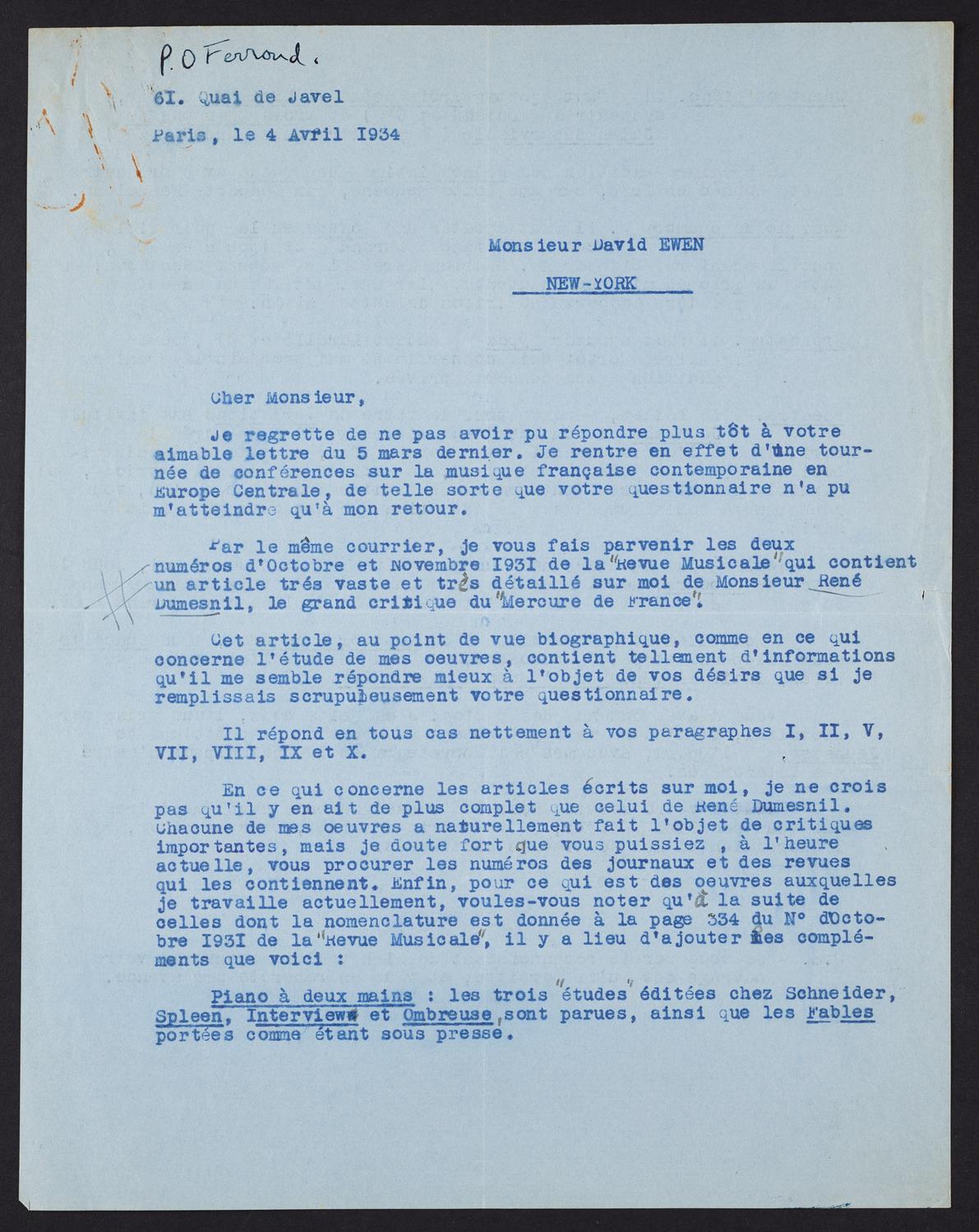 Conceptually similarCorrespondence from Pierre-Octave Ferroud to David Ewen, page 2 of 2 Correspondence from Paul Dupin to David Ewen, page 1 of 2 Correspondence from Bohuslav Martinu to David Ewen, page 1 of 2 Correspondence from Frank Martin to David Ewen, page 1 of 4 Correspondence from Vincenzo Tommasini to David Ewen, page 1 of 5 Correspondence from Paul Dupin to David Ewen, page 2 of 2 Correspondence from Bohuslav Martinu to David Ewen, page 2 of 2 Correspondence from George Migot to David Ewen, page 2 of 11 Correspondence from Felix Weingartner to David Ewen, page 2 of 8 View MoreYour right to access the Digital Collections is subject to these Terms and Conditions.CH1391748 Correspondence from Pierre-Octave Ferroud to David Ewen, page 1 of 2Pierre-Octave Ferroud answers David Ewen's questionnaire. CONTENT TYPE: correspondenceNames: David Ewen (1907–1985)Pierre-Octave Ferroud (1900–1936)SEASON: 1933-1934Date: April 4, 1934 YEAR: 1934 Credit: Courtesy of Carnegie Hall Archives Source name: Carnegie Hall Rose ArchivesDepartment: Rose Museum and ArchivesCollection: Geiger Collection of Modern ComposersPlace: Paris LANGUAGE: French Size: 7164px × 9024px (~184 MB) Archives Unique ID: CHA-GCMC-011_01 RIGHTS STATEMENT: NO KNOWN COPYRIGHTCarnegie Hall reasonably believes that the item is not restricted by copyright or related rights, but a conclusive determination could not be made.Though not required, if you want to credit us as the source, please use the statement "Courtesy of Carnegie Hall Rose Archives" and provide a link back to the item on our Digital Collections site. Doing so helps us track how our collection is used and helps justify freely releasing even more content in the future. DownloadRelated materials: View MoreCorrespondence from Georges-Martin Witkowski to David Ewen, page 4 of 4 Correspondence from Georges-Martin Witkowski to David Ewen, page 3 of 4 Correspondence from Georges-Martin Witkowski to David Ewen, page 2 of 4 Correspondence from Georges-Martin Witkowski to David Ewen, page 1 of 4 Correspondence from Egon Wellesz to David Ewen, page 2 of 2 Correspondence from Egon Wellesz to David Ewen, page 1 of 2 RELATED: Geiger Collection of Modern Composers