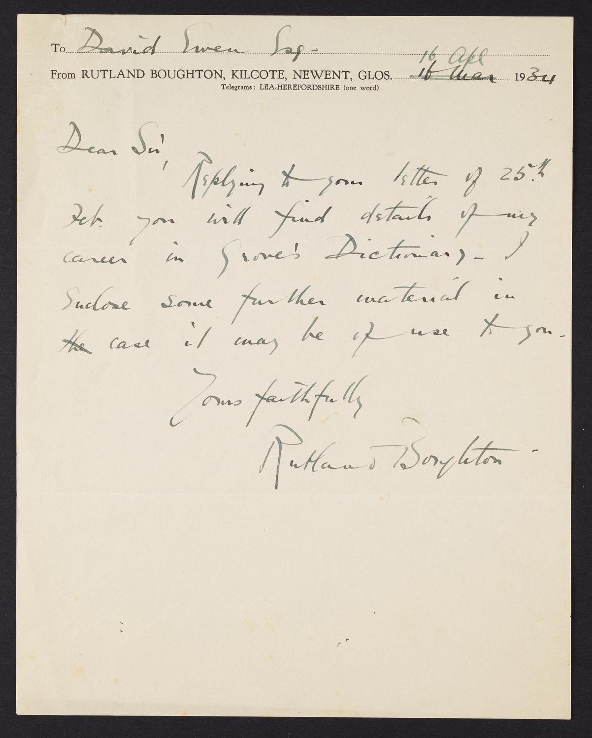 Conceptually similarCorrespondence from Abram Chasins to David Ewen Correspondence from Leone Sinigaglia to David Ewen Correspondence from Werner Josten to David Ewen Correspondence from Arnold Schoenberg to David Ewen Correspondence from Fritz Stiedry to David Ewen Correspondence from Alexandre Tansman to David Ewen Correspondence from Edgar Varese to David Ewen Correspondence from Jean Sibelius to David Ewen Correspondence from Henri Gagnebin to David Ewen, page 1 of 8 View MoreYour right to access the Digital Collections is subject to these Terms and Conditions.CH1390695 Correspondence from Rutland Boughton to David EwenLetter from Rutland Boughton to David Ewen. CONTENT TYPE: correspondenceNames: David Ewen (1907–1985)Rutland Boughton (1878–1960)SEASON: 1933-1934Date: April 16, 1934 YEAR: 1934 Credit: Courtesy of Carnegie Hall Archives Source name: Carnegie Hall Rose ArchivesDepartment: Rose Museum and ArchivesCollection: Geiger Collection of Modern ComposersPlace: Gloucestershire LANGUAGE: English Size: 6163px × 7689px (~135 MB) Archives Unique ID: CHA-GCMC-002_01 RIGHTS STATEMENT: NO KNOWN COPYRIGHTCarnegie Hall reasonably believes that the item is not restricted by copyright or related rights, but a conclusive determination could not be made.Though not required, if you want to credit us as the source, please use the statement "Courtesy of Carnegie Hall Rose Archives" and provide a link back to the item on our Digital Collections site. Doing so helps us track how our collection is used and helps justify freely releasing even more content in the future. DownloadRelated materials: View MoreCorrespondence from Georges-Martin Witkowski to David Ewen, page 4 of 4 Correspondence from Georges-Martin Witkowski to David Ewen, page 3 of 4 Correspondence from Georges-Martin Witkowski to David Ewen, page 2 of 4 Correspondence from Georges-Martin Witkowski to David Ewen, page 1 of 4 Correspondence from Egon Wellesz to David Ewen, page 2 of 2 Correspondence from Egon Wellesz to David Ewen, page 1 of 2 RELATED: Geiger Collection of Modern Composers