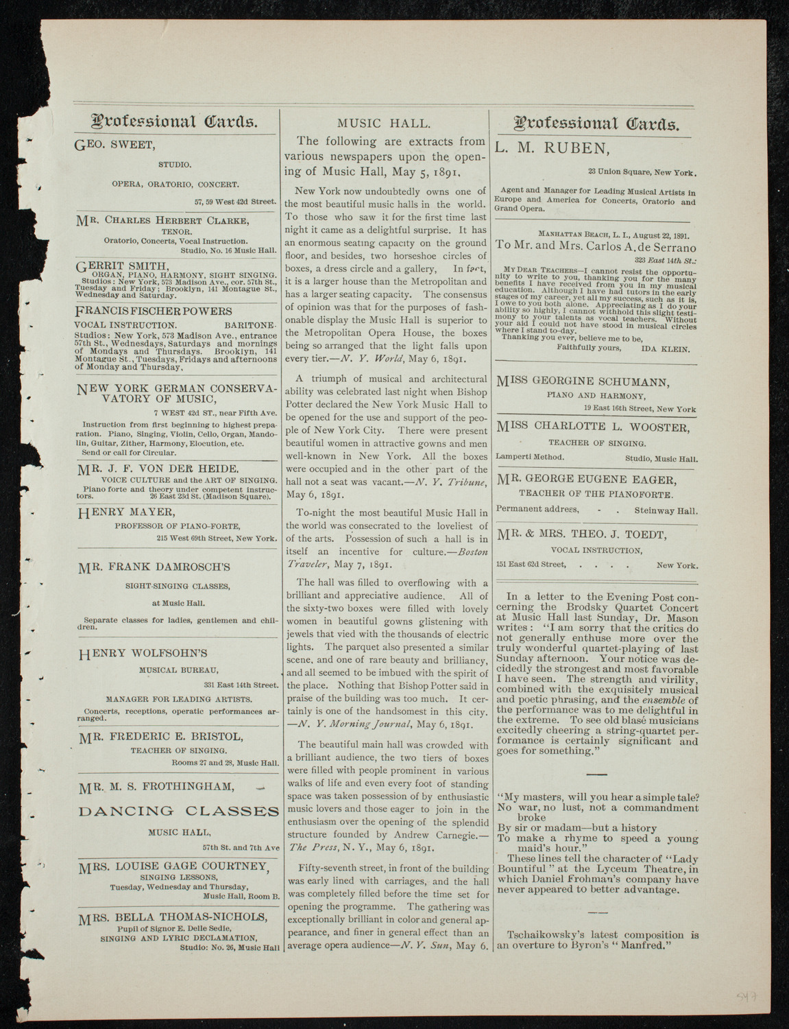 Conceptually similarDamrosch Sunday Concert, January 10, 1892, program page 10 Damrosch Sunday Concert, January 10, 1892, program page 7 Damrosch Sunday Concert, January 10, 1892, program page 4 Damrosch Sunday Concert, January 10, 1892, program page 6 Damrosch Sunday Concert, January 10, 1892, program page 2 Damrosch Sunday Concert, January 3, 1892, program page 10 Damrosch Sunday Concert, January 10, 1892, program page 12 Damrosch Sunday Concert, January 10, 1892, program page 8 Damrosch Sunday Concert, January 10, 1892, program page 1 View MoreYour right to access the Digital Collections is subject to these Terms and Conditions.CH1101733 Damrosch Sunday Concert, January 10, 1892, program page 11Review indicates that the selections from Mascagni's "L'amico Fritz" were performed with piano accompaniment, played by Walter Damrosch.U.S. PREMIERE of several selections from Pietro Mascagni's L'AMICO FRITZ CONTENT TYPE: program pageSEASON: 1891-1892Date: January 10, 1892 YEAR: 1892 Credit: Courtesy of Carnegie Hall Archives Source name: Carnegie Hall Rose ArchivesDepartment: Rose Museum and ArchivesCollection: Programs CollectionPlace: New York, NY LANGUAGE: English Size: 3227px × 4205px (~38 MB) RIGHTS STATEMENT: NO COPYRIGHT - UNITED STATESCarnegie Hall believes that this item is in the public domain under the laws of the United States, but a determination was not made as to its copyright status under the copyright laws of other countries. The item may not be in the public domain under the laws of other countries. Read full Rights StatementThough not required, if you want to credit us as the source, please use the statement "Courtesy of Carnegie Hall Rose Archives" and provide a link back to the item on our Digital Collections site. Doing so helps us track how our collection is used and helps justify freely releasing even more content in the future. Sunday, January 10, 1892 at 8:15PM SEASON: 1891-1892VENUE: Main HallDownloadRelated materials: View MorePDFComplete program of Damrosch Sunday Concert, January 10, 1892 Damrosch Sunday Concert, January 10, 1892, program page 12 Damrosch Sunday Concert, January 10, 1892, program page 10 Damrosch Sunday Concert, January 10, 1892, program page 9 Damrosch Sunday Concert, January 10, 1892, program page 8 RELATED: Carnegie Hall Programs