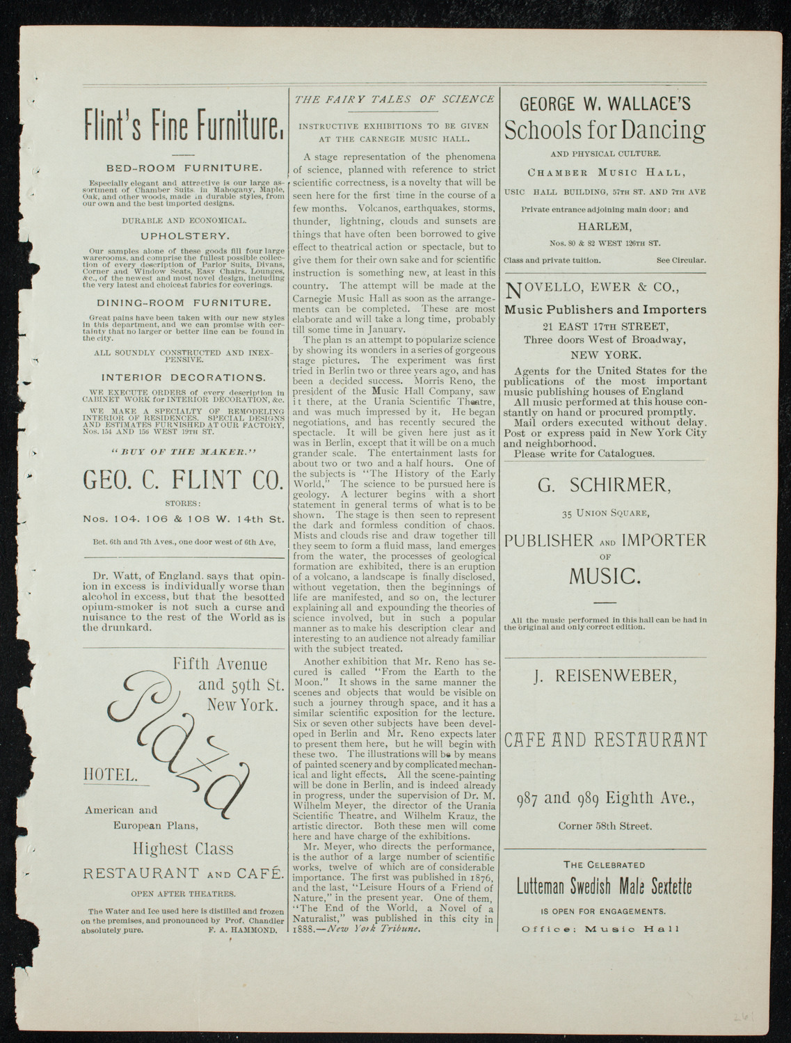 Conceptually similarDeutscher Liederkranz, November 29, 1891, program page 5 Deutscher Liederkranz, November 29, 1891, program page 7 Deutscher Liederkranz, November 29, 1891, program page 15 Deutscher Liederkranz, November 29, 1891, program page 2 Deutscher Liederkranz, November 29, 1891, program page 3 Deutscher Liederkranz, November 29, 1891, program page 10 Deutscher Liederkranz, November 29, 1891, program page 6 Deutscher Liederkranz, November 29, 1891, program page 4 Deutscher Liederkranz, November 29, 1891, program page 14 View MoreYour right to access the Digital Collections is subject to these Terms and Conditions.CH1101468 Deutscher Liederkranz, November 29, 1891, program page 13CONTENT TYPE: program pageSEASON: 1891-1892Date: November 29, 1891 YEAR: 1891 Credit: Courtesy of Carnegie Hall Archives Source name: Carnegie Hall Rose ArchivesDepartment: Rose Museum and ArchivesCollection: Programs CollectionPlace: New York, NY LANGUAGE: English Size: 3228px × 4257px (~39 MB) RIGHTS STATEMENT: NO COPYRIGHT - UNITED STATESCarnegie Hall believes that this item is in the public domain under the laws of the United States, but a determination was not made as to its copyright status under the copyright laws of other countries. The item may not be in the public domain under the laws of other countries. Read full Rights StatementThough not required, if you want to credit us as the source, please use the statement "Courtesy of Carnegie Hall Rose Archives" and provide a link back to the item on our Digital Collections site. Doing so helps us track how our collection is used and helps justify freely releasing even more content in the future. Sunday, November 29, 1891 at 8:00PM SEASON: 1891-1892VENUE: Main HallDownloadRelated materials: View MorePDFComplete program of Deutscher Liederkranz, November 29, 1891 Deutscher Liederkranz, November 29, 1891, program page 16 Deutscher Liederkranz, November 29, 1891, program page 15 Deutscher Liederkranz, November 29, 1891, program page 14 Deutscher Liederkranz, November 29, 1891, program page 12 RELATED: Carnegie Hall Programs