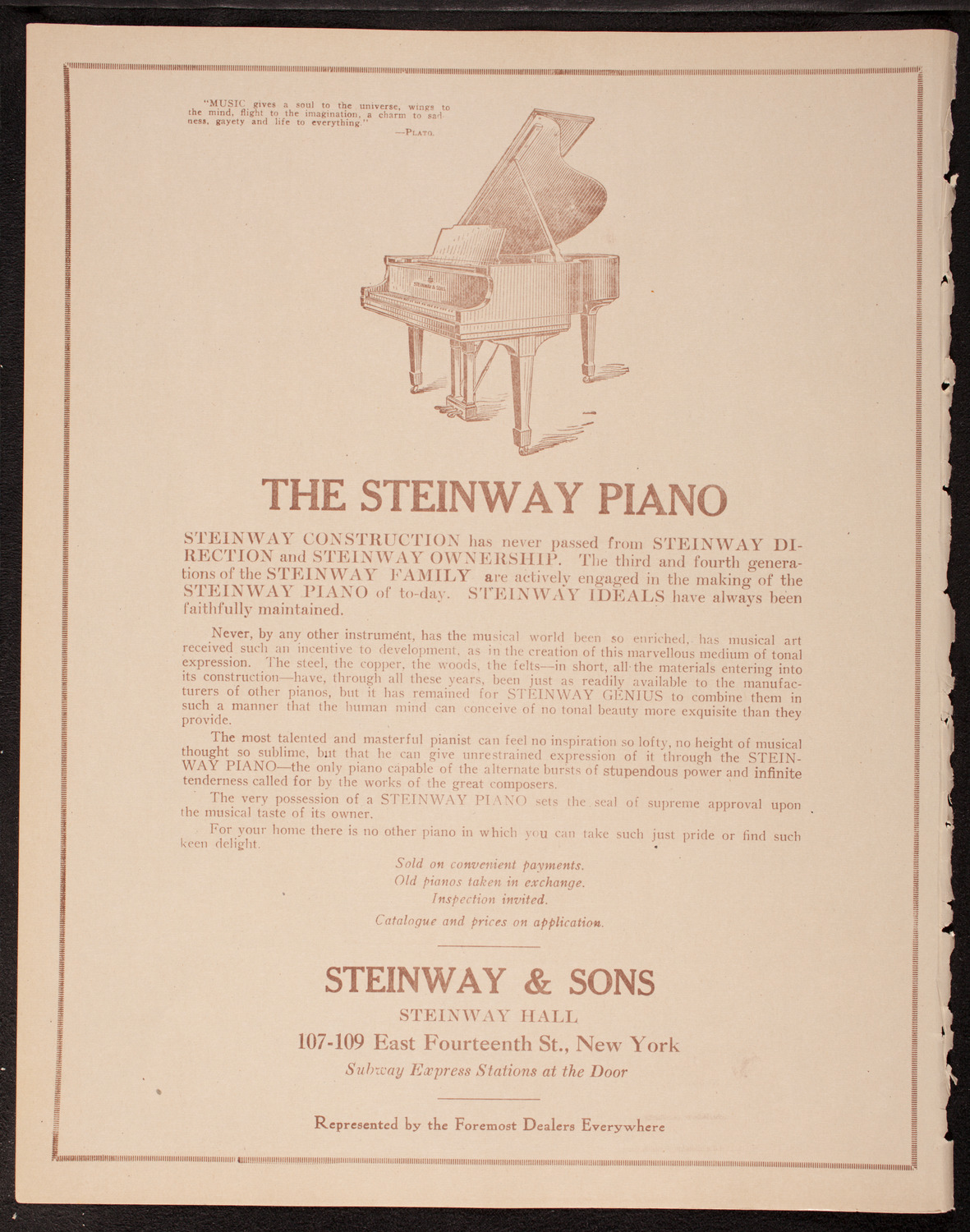 Conceptually similarGeorge Baklanoff, Baritone, November 8, 1919, program page 8 George Baklanoff, Baritone, November 8, 1919, program page 3 George Baklanoff, Baritone, November 8, 1919, program page 10 George Baklanoff, Baritone, November 8, 1919, program page 11 George Baklanoff, Baritone, November 8, 1919, program page 2 George Baklanoff, Baritone, November 8, 1919, program page 7 George Baklanoff, Baritone, November 8, 1919, program page 1 George Baklanoff, Baritone, November 8, 1919, program page 5 George Baklanoff, Baritone, November 8, 1919, program page 12 View MoreYour right to access the Digital Collections is subject to these Terms and Conditions.CH1149755 George Baklanoff, Baritone, November 8, 1919, program page 4Some details confirmed in New York Times review, Nov. 9, 1919, pg. 22. CONTENT TYPE: program pageSEASON: 1919-1920Date: November 8, 1919 YEAR: 1919 Credit: Courtesy of Carnegie Hall Archives Source name: Carnegie Hall Rose ArchivesDepartment: Rose Museum and ArchivesCollection: Programs CollectionPlace: New York, NY LANGUAGE: English Size: 3669px × 4659px (~48 MB) RIGHTS STATEMENT: NO COPYRIGHT - UNITED STATESCarnegie Hall believes that this item is in the public domain under the laws of the United States, but a determination was not made as to its copyright status under the copyright laws of other countries. The item may not be in the public domain under the laws of other countries. Read full Rights StatementThough not required, if you want to credit us as the source, please use the statement "Courtesy of Carnegie Hall Rose Archives" and provide a link back to the item on our Digital Collections site. Doing so helps us track how our collection is used and helps justify freely releasing even more content in the future. Saturday, November 8, 1919 at 8:15PM SEASON: 1919-1920VENUE: Main HallDownloadRelated materials: View MorePDFComplete program of George Baklanoff, November 8, 1919 George Baklanoff, Baritone, November 8, 1919, program page 2 George Baklanoff, Baritone, November 8, 1919, program page 8 George Baklanoff, Baritone, November 8, 1919, program page 7 George Baklanoff, Baritone, November 8, 1919, program page 5 George Baklanoff, Baritone, November 8, 1919, program page 6 RELATED: Carnegie Hall Programs