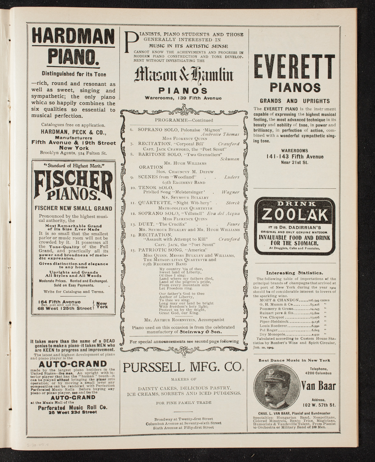 Conceptually similarGrand Army of the Republic Memorial Day Exercises, May 30, 1905, program page 6 Grand Army of the Republic Memorial Day Exercises, May 30, 1905, program page 8 Grand Army of the Republic Memorial Day Exercises, May 30, 1905, program page 9 Grand Army of the Republic Memorial Day Exercises, May 30, 1905, program page 1 Grand Army of the Republic Memorial Day Exercises, May 30, 1905, program page 3 Grand Army of the Republic Memorial Day Exercises, May 30, 1905, program page 11 Grand Army of the Republic Memorial Day Exercises, May 30, 1905, program page 12 Grand Army of the Republic Memorial Day Exercises, May 30, 1905, program page 4 Grand Army of the Republic Memorial Day Exercises, May 30, 1905, program page 2 View MoreYour right to access the Digital Collections is subject to these Terms and Conditions.CH163795 Grand Army of the Republic Memorial Day Exercises, May 30, 1905, program page 7The stated time is approximate. CONTENT TYPE: program pageSEASON: 1904-1905Date: May 30, 1905 YEAR: 1905 Credit: Courtesy of Carnegie Hall Archives Source name: Carnegie Hall Rose ArchivesDepartment: Rose Museum and ArchivesCollection: Programs CollectionPlace: New York, NY LANGUAGE: English Size: 3744px × 4608px (~49 MB) RIGHTS STATEMENT: NO COPYRIGHT - UNITED STATESCarnegie Hall believes that this item is in the public domain under the laws of the United States, but a determination was not made as to its copyright status under the copyright laws of other countries. The item may not be in the public domain under the laws of other countries. Read full Rights StatementThough not required, if you want to credit us as the source, please use the statement "Courtesy of Carnegie Hall Rose Archives" and provide a link back to the item on our Digital Collections site. Doing so helps us track how our collection is used and helps justify freely releasing even more content in the future. Tuesday, May 30, 1905 at 8:00PM SEASON: 1904-1905VENUE: Main HallDownloadRelated materials: View MorePDFComplete program of Grand Army of the Republic Memorial Day Exercises, May 30, 1905 Grand Army of the Republic Memorial Day Exercises, May 30, 1905, program page 12 Grand Army of the Republic Memorial Day Exercises, May 30, 1905, program page 11 Grand Army of the Republic Memorial Day Exercises, May 30, 1905, program page 10 Grand Army of the Republic Memorial Day Exercises, May 30, 1905, program page 9 Grand Army of the Republic Memorial Day Exercises, May 30, 1905, program page 8 RELATED: Carnegie Hall Programs