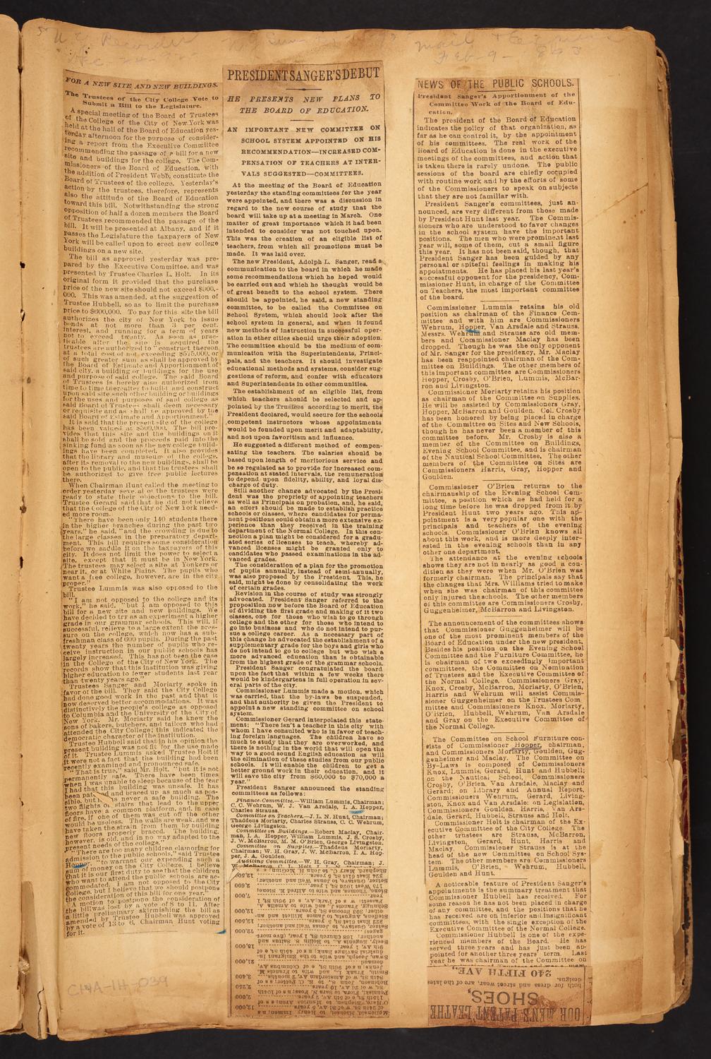 Conceptually similarIsaac Hopper Scrapbook, page 39 (overlay): 1892-1893 Isaac Hopper Scrapbook, page 35: 1892-1893 Isaac Hopper Scrapbook, page 38: 1892-1893 Isaac Hopper Scrapbook, page 30: 1892 Isaac Hopper Scrapbook, page 11: 1893 Isaac Hopper Scrapbook, page 9: 1893 Isaac Hopper Scrapbook, page 29: 1892-1894 Isaac Hopper Scrapbook, page 31: 1892 Isaac Hopper Scrapbook, page 28: 1891-1894 View MoreYour right to access the Digital Collections is subject to these Terms and Conditions.CH1398143 Isaac Hopper Scrapbook, page 39: 1892-1893"For a New Site and New Buildings." New York Recorder, December 24, 1892: New site for College of the City of New York."President Sanger's Debut." New York Sun, February 15, 1892: President Sanger and new committee."News of the Public School." Mail & Express, February 9, 1893: President Sanger announces new committee. CONTENT TYPE: newspaper clipping, scrapbook pageNames: Isaac A. HopperDate: 1892-1893 Credit: Courtesy of Carnegie Hall Rose Archives. Donated by Patricia Hopper Strasberg in honor of her great-grandfather, Isaac A. Hopper, with love and respect for a life of service in the New York building trades and political life of the times. Source name: Carnegie Hall Rose ArchivesDepartment: Rose Museum and ArchivesCollection: Isaac Hopper CollectionPlace: New York, NY LANGUAGE: English Size: 7278px × 10833px (~225 MB) Archives Unique ID: CHA-IH-039_a RIGHTS STATEMENT: NO COPYRIGHT - UNITED STATESCarnegie Hall believes that this item is in the public domain under the laws of the United States, but a determination was not made as to its copyright status under the copyright laws of other countries. The item may not be in the public domain under the laws of other countries. Read full Rights StatementThough not required, if you want to credit us as the source, please use the statement "Courtesy of Carnegie Hall Rose Archives" and provide a link back to the item on our Digital Collections site. Doing so helps us track how our collection is used and helps justify freely releasing even more content in the future. DownloadRelated materials: View MoreIsaac Hopper Scrapbook, back cover Isaac Hopper Scrapbook, blank page (opposite back cover) Isaac Hopper Scrapbook, back cover (inside) Isaac Hopper Scrapbook, page 241 (loose article 2, back): 1898 Isaac Hopper Scrapbook, page 241 (loose article 2, front): 1898 Isaac Hopper Scrapbook, page 241 (loose article 1, back): 1898 RELATED: Isaac A. Hopper Scrapbook
