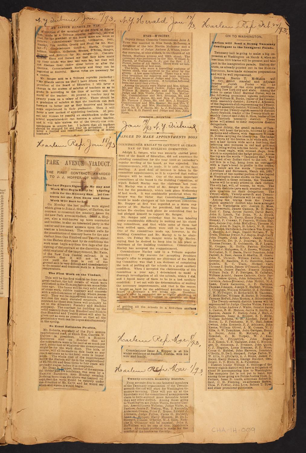 Conceptually similarIsaac Hopper Scrapbook, page 18: 1893 Isaac Hopper Scrapbook, page 17: 1893 Isaac Hopper Scrapbook, page 10: 1893 Isaac Hopper Scrapbook, page 52: 1893 Isaac Hopper Scrapbook, page 40: 1893 Isaac Hopper Scrapbook, page 12: 1893 Isaac Hopper Scrapbook, page 19: 1893 Isaac Hopper Scrapbook, page 11: 1893 Isaac Hopper Scrapbook, page 41: 1891-1893 View MoreYour right to access the Digital Collections is subject to these Terms and Conditions.CH1398110 Isaac Hopper Scrapbook, page 9: 1893"Mr. Sanger Expects to Win." New York Tribune, January 11, 1893: Board of Education vote."Sanger to Make Appointments Soon." New York Tribune, January 19, 1893: Board of Education building committee appointments."Ryan--M'Inerny." New York Herald, January 12, 1893: Isaac Hopper and wife attended wedding."Park Avenue Viaduct." Harlem Reporter, January 18, 1893: Contracts for the Park Avenue Viaduct."On To Washington." Harlem Reporter, February 22, 1893: Tammany Hall heads to Inaugural Parade.Harlem Reporter, March 8, 1893: Isaac Hopper at Florida estate."Twenty-seventh Assembly District." Harlem Reporter, March 1, 1893: Tammany Hall heads to Inaugural Parade. CONTENT TYPE: newspaper clipping, scrapbook pageNames: Isaac A. HopperSEASON: 1892-1893YEAR: 1893 Credit: Courtesy of Carnegie Hall Rose Archives. Donated by Patricia Hopper Strasberg in honor of her great-grandfather, Isaac A. Hopper, with love and respect for a life of service in the New York building trades and political life of the times. Source name: Carnegie Hall Rose ArchivesDepartment: Rose Museum and ArchivesCollection: Isaac Hopper CollectionPlace: New York, NY LANGUAGE: English Size: 7223px × 10694px (~220 MB) Archives Unique ID: CHA-IH-009 RIGHTS STATEMENT: NO COPYRIGHT - UNITED STATESCarnegie Hall believes that this item is in the public domain under the laws of the United States, but a determination was not made as to its copyright status under the copyright laws of other countries. The item may not be in the public domain under the laws of other countries. Read full Rights StatementThough not required, if you want to credit us as the source, please use the statement "Courtesy of Carnegie Hall Rose Archives" and provide a link back to the item on our Digital Collections site. Doing so helps us track how our collection is used and helps justify freely releasing even more content in the future. DownloadRelated materials: View MoreIsaac Hopper Scrapbook, back cover Isaac Hopper Scrapbook, blank page (opposite back cover) Isaac Hopper Scrapbook, back cover (inside) Isaac Hopper Scrapbook, page 241 (loose article 2, back): 1898 Isaac Hopper Scrapbook, page 241 (loose article 2, front): 1898 Isaac Hopper Scrapbook, page 241 (loose article 1, back): 1898 RELATED: Isaac A. Hopper Scrapbook