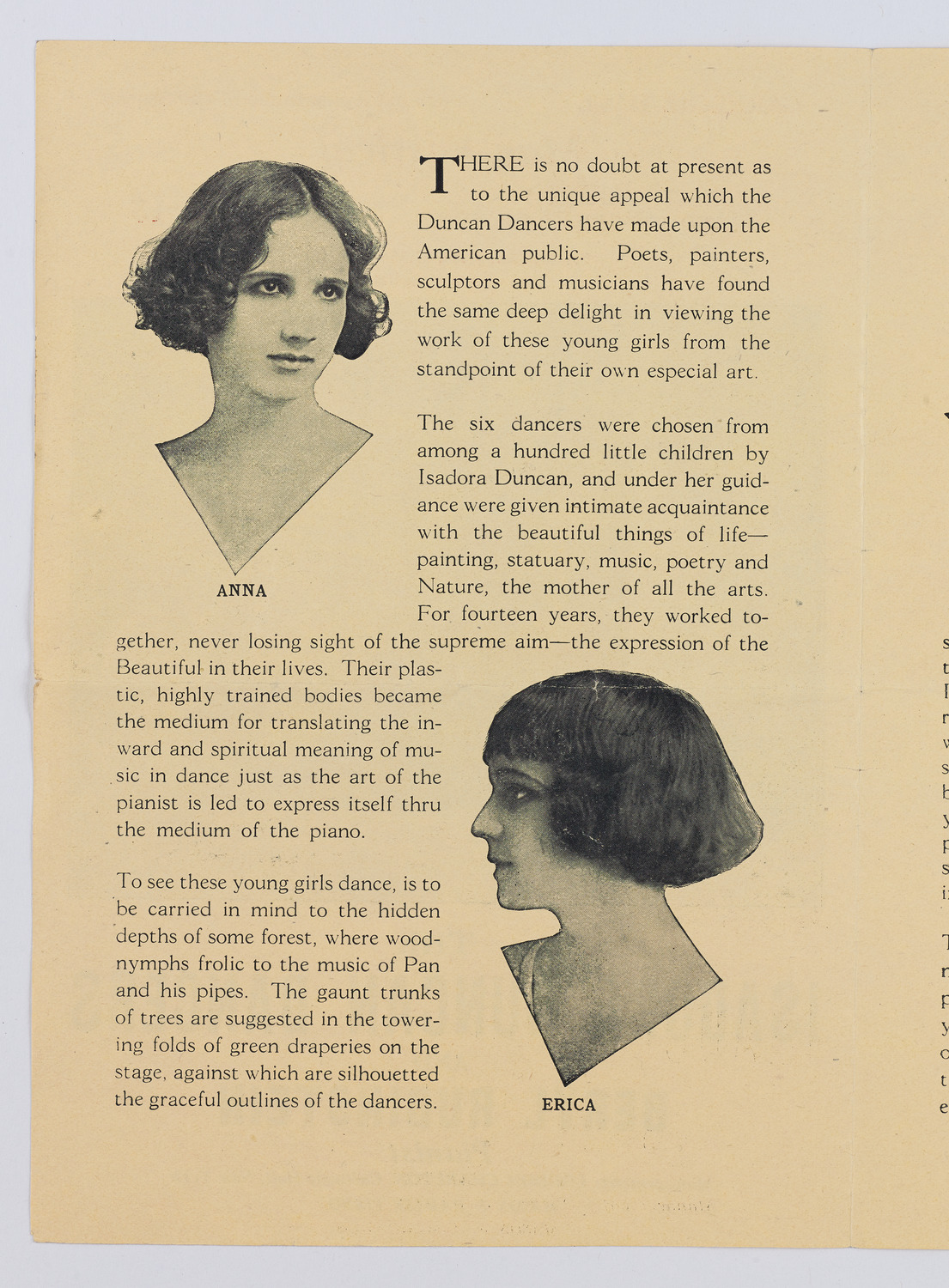 Conceptually similarIsadora Duncan Dancers, May 1920 Isadora Duncan Dancers, May 1920 Isadora Duncan Dancers, May 1920 Isadora Duncan Dancers, June 1919 Isadora Duncan Dancers, June 1919 Isadora Duncan Dancers, June 1919 Isadora Duncan Dancers, June 1919 Isadora Duncan Dancers and George Copeland, June 1918 Isadora Duncan Dancers and George Copeland, June 1918 View MoreYour right to access the Digital Collections is subject to these Terms and Conditions.CH153101 Isadora Duncan Dancers, May 1920CONTENT TYPE: flyerNames: Anna Duncan (1894–1980)Beryl Rubinstein (1898–1952)Erica Duncan (1901–1984)Irma Duncan (1897–1977)Isadora Duncan DancersLisa Duncan (1898–1976)Margot (Gretel) Duncan (1900–1925)Maria-Theresa (1896–1987)SEASON: 1919-1920Date: May 12, 1920 Additional dates: 05/14/1920, 05/15/1920 YEAR: 1920 VENUE: Main HallCredit: Courtesy of Carnegie Hall Archives Source name: Carnegie Hall Rose ArchivesDepartment: Rose Museum and ArchivesCollection: Flyers CollectionPlace: New York, NY LANGUAGE: English Size: 4343px × 5897px (~73 MB) Archives Unique ID: CHA-FL-01293 RIGHTS STATEMENT: NO COPYRIGHT - UNITED STATESCarnegie Hall believes that this item is in the public domain under the laws of the United States, but a determination was not made as to its copyright status under the copyright laws of other countries. The item may not be in the public domain under the laws of other countries. Read full Rights StatementThough not required, if you want to credit us as the source, please use the statement "Courtesy of Carnegie Hall Rose Archives" and provide a link back to the item on our Digital Collections site. Doing so helps us track how our collection is used and helps justify freely releasing even more content in the future. DownloadRelated materials: View MorePDFComplete program of Isadora Duncan Dancers, May 12, 1920 Isadora Duncan Dancers, May 12, 1920, program page 12 Isadora Duncan Dancers, May 12, 1920, program page 11 Isadora Duncan Dancers, May 12, 1920, program page 10 Isadora Duncan Dancers, May 12, 1920, program page 9 Isadora Duncan Dancers, May 12, 1920, program page 8 RELATED: Flyers, Posters, and Window Cards