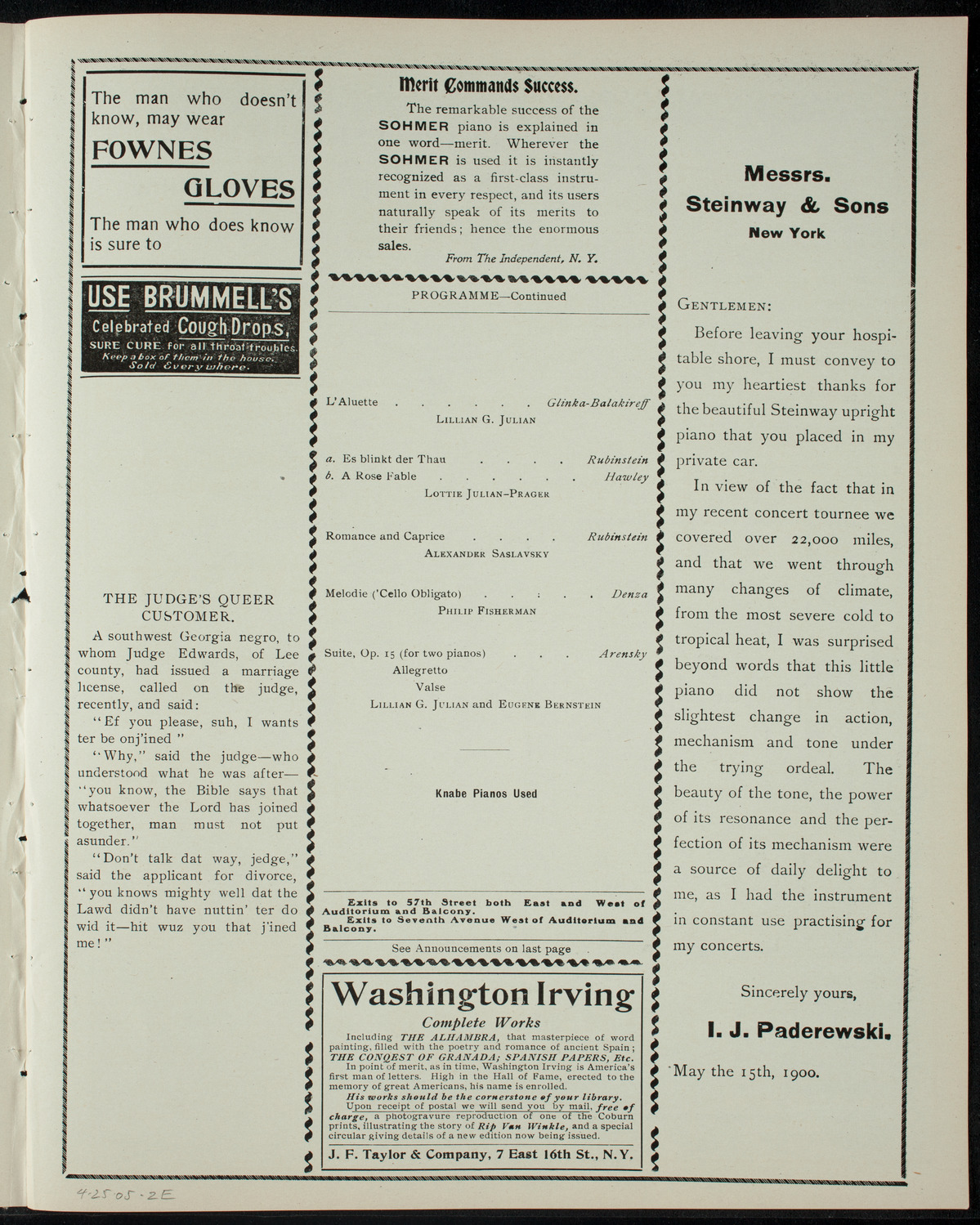 Conceptually similarLillian G. Julian with Others, April 25, 1905, program page 1 Lillian G. Julian with Others, April 25, 1905, program page 4 Lillian G. Julian with Others, April 25, 1905, program page 2 Lillian Marcus with Others, March 12, 1905, program page 3 Lillian Marcus with Others, March 12, 1905, program page 1 Lillian Marcus with Others, March 12, 1905, program page 4 Lillian Marcus with Others, March 12, 1905, program page 2 Daniel Wischnevetzky with Others, May 14, 1905, program page 3 Samuel Margolis and Others, February 12, 1905, program page 3 View MoreYour right to access the Digital Collections is subject to these Terms and Conditions.CH1101161 Lillian G. Julian with Others, April 25, 1905, program page 3CONTENT TYPE: program pageSEASON: 1904-1905Date: April 25, 1905 YEAR: 1905 Credit: Courtesy of Carnegie Hall Archives Source name: Carnegie Hall Rose ArchivesDepartment: Rose Museum and ArchivesCollection: Programs CollectionPlace: New York, NY LANGUAGE: English Size: 3628px × 4537px (~47 MB) RIGHTS STATEMENT: NO COPYRIGHT - UNITED STATESCarnegie Hall believes that this item is in the public domain under the laws of the United States, but a determination was not made as to its copyright status under the copyright laws of other countries. The item may not be in the public domain under the laws of other countries. Read full Rights StatementThough not required, if you want to credit us as the source, please use the statement "Courtesy of Carnegie Hall Rose Archives" and provide a link back to the item on our Digital Collections site. Doing so helps us track how our collection is used and helps justify freely releasing even more content in the future. Tuesday, April 25, 1905 at 8:15PM SEASON: 1904-1905VENUE: Carnegie LyceumDownloadRelated materials: View MorePDFComplete program of Lillian G. Julian with Others, April 25, 1905 Lillian G. Julian with Others, April 25, 1905, program page 4 Lillian G. Julian with Others, April 25, 1905, program page 2 Lillian G. Julian with Others, April 25, 1905, program page 1 Suite No. 1 in F Major, Op. 15: 2. Valse RELATED: Carnegie Hall Programs