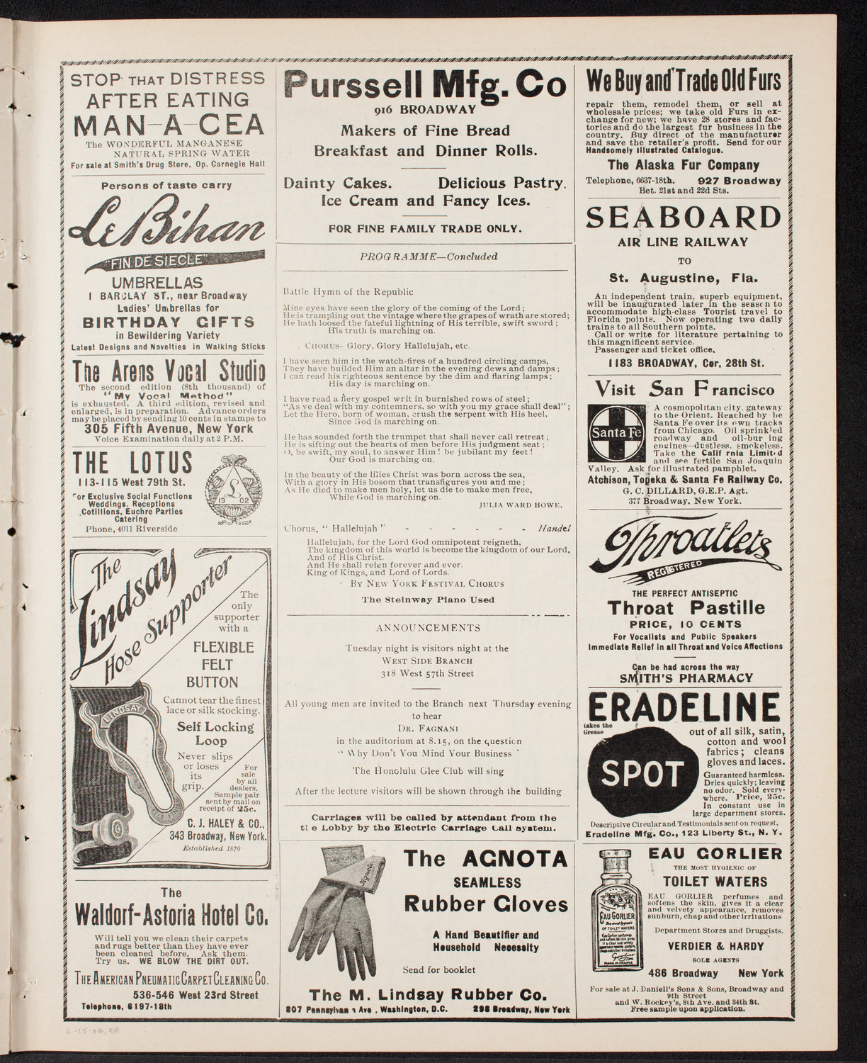 Conceptually similarMeeting: YMCA/ Mass Meeting for Men, February 15, 1903, program page 10 Meeting: YMCA/ Mass Meeting for Men, February 15, 1903, program page 8 Meeting: YMCA/ Mass Meeting for Men, February 15, 1903, program page 4 Meeting: YMCA/ Mass Meeting for Men, February 15, 1903, program page 11 Meeting: YMCA/ Mass Meeting for Men, February 15, 1903, program page 6 Meeting: YMCA/ Mass Meeting for Men, February 15, 1903, program page 2 Meeting: YMCA/ Mass Meeting for Men, February 8, 1903, program page 9 Meeting: YMCA/ Mass Meeting for Men, February 15, 1903, program page 5 Meeting: YMCA/ Mass Meeting for Men, February 15, 1903, program page 1 View MoreYour right to access the Digital Collections is subject to these Terms and Conditions.CH150816 Meeting: YMCA/ Mass Meeting for Men, February 15, 1903, program page 9Mass Meeting for Men under the auspices of the West Side Branch, Young Men's Christian Association of the City of New York CONTENT TYPE: program pageSEASON: 1902-1903Date: February 15, 1903 YEAR: 1903 Credit: Courtesy of Carnegie Hall Archives Source name: Carnegie Hall Rose ArchivesDepartment: Rose Museum and ArchivesCollection: Programs CollectionPlace: New York, NY LANGUAGE: English Size: 3706px × 4542px (~48 MB) RIGHTS STATEMENT: NO COPYRIGHT - UNITED STATESCarnegie Hall believes that this item is in the public domain under the laws of the United States, but a determination was not made as to its copyright status under the copyright laws of other countries. The item may not be in the public domain under the laws of other countries. Read full Rights StatementThough not required, if you want to credit us as the source, please use the statement "Courtesy of Carnegie Hall Rose Archives" and provide a link back to the item on our Digital Collections site. Doing so helps us track how our collection is used and helps justify freely releasing even more content in the future. Sunday, February 15, 1903 at 3:45PM SEASON: 1902-1903VENUE: Main HallDownloadRelated materials: View MorePDFComplete program of Meeting: YMCA/ Mass Meeting for Men, February 15, 1903 Ticket for Address by Charles Emory Smith, February 15, 1903 (front) Ticket for Address by Charles Emory Smith, February 15, 1903 (back) Meeting: YMCA/ Mass Meeting for Men, February 15, 1903, program page 12 Meeting: YMCA/ Mass Meeting for Men, February 15, 1903, program page 11 Meeting: YMCA/ Mass Meeting for Men, February 15, 1903, program page 10 RELATED: Carnegie Hall Programs