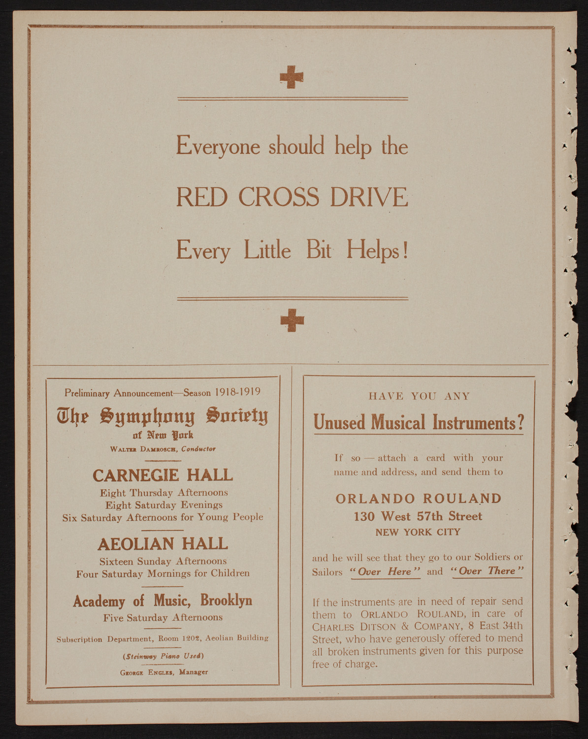 Conceptually similarMetropolitan Opera House Orchestra, June 4, 1918, program page 9 Metropolitan Opera House Orchestra, June 4, 1918, program page 4 Metropolitan Opera House Orchestra, June 4, 1918, program page 11 Metropolitan Opera House Orchestra, June 4, 1918, program page 3 Metropolitan Opera House Orchestra, June 4, 1918, program page 7 Metropolitan Opera House Orchestra, June 4, 1918, program page 6 Metropolitan Opera House Orchestra, June 4, 1918, program page 5 Metropolitan Opera House Orchestra, June 4, 1918, program page 2 Metropolitan Opera House Orchestra, June 4, 1918, program page 12 View MoreYour right to access the Digital Collections is subject to these Terms and Conditions.CH1148074 Metropolitan Opera House Orchestra, June 4, 1918, program page 8According to note in program, the first movement of the Rubinstein Concerto was played on an Ampico Reproducing Piano from a recording made by Leo Ornstein. A review in the New York Sun indicates "[t]he purpose of the recital was to demonstrate the qualities of the Ampico and the purpose was remarkably successful."The sun. [volume] (New York [N.Y.]), 05 June 1918. Chronicling America: Historic American Newspapers. Lib. of Congress. <a rel="noopener noreferrer" class="external" href="https://chroniclingamerica.loc.gov/lccn/sn83030431/1918-06-05/ed-1/seq-7/" target="_blank">Link to review (column 2)</a> CONTENT TYPE: program pageSEASON: 1917-1918Date: June 4, 1918 YEAR: 1918 Credit: Courtesy of Carnegie Hall Archives Source name: Carnegie Hall Rose ArchivesDepartment: Rose Museum and ArchivesCollection: Programs CollectionPlace: New York, NY LANGUAGE: English Size: 3459px × 4346px (~43 MB) RIGHTS STATEMENT: NO COPYRIGHT - UNITED STATESCarnegie Hall believes that this item is in the public domain under the laws of the United States, but a determination was not made as to its copyright status under the copyright laws of other countries. The item may not be in the public domain under the laws of other countries. Read full Rights StatementThough not required, if you want to credit us as the source, please use the statement "Courtesy of Carnegie Hall Rose Archives" and provide a link back to the item on our Digital Collections site. Doing so helps us track how our collection is used and helps justify freely releasing even more content in the future. Tuesday, June 4, 1918 at 3:00PM SEASON: 1917-1918VENUE: Main HallDownloadRelated materials: View MorePDFComplete program of Metropolitan Opera House Orchestra, June 4, 1918 Metropolitan Opera House Orchestra, June 4, 1918, program page 12 Metropolitan Opera House Orchestra, June 4, 1918, program page 11 Metropolitan Opera House Orchestra, June 4, 1918, program page 10 Metropolitan Opera House Orchestra, June 4, 1918, program page 9 RELATED: Carnegie Hall Programs