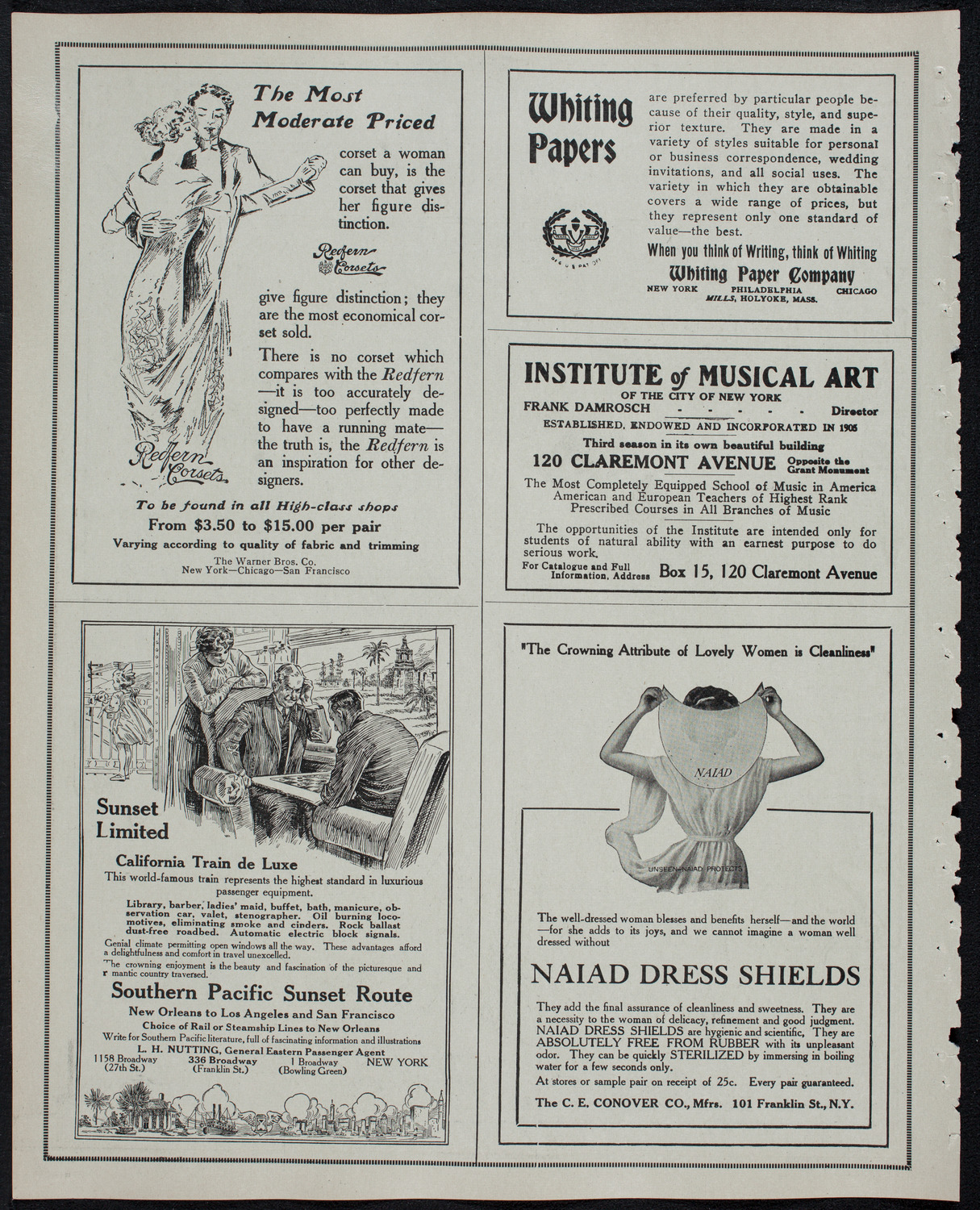 Conceptually similarMinneapolis Symphony Orchestra, February 21, 1913, program page 8 Minneapolis Symphony Orchestra, February 21, 1913, program page 4 Minneapolis Symphony Orchestra, February 21, 1913, program page 7 Minneapolis Symphony Orchestra, February 21, 1913, program page 9 Minneapolis Symphony Orchestra, February 21, 1913, program page 10 Minneapolis Symphony Orchestra, February 21, 1913, program page 12 Minneapolis Symphony Orchestra, February 21, 1913, program page 3 Minneapolis Symphony Orchestra, February 21, 1913, program page 1 Minneapolis Symphony Orchestra, February 21, 1913, program page 6 View MoreYour right to access the Digital Collections is subject to these Terms and Conditions.CH182628 Minneapolis Symphony Orchestra, February 21, 1913, program page 2Manager: Wendell Heighton CONTENT TYPE: program pageSEASON: 1912-1913Date: February 21, 1913 YEAR: 1913 Credit: Courtesy of Carnegie Hall Archives Source name: Carnegie Hall Rose ArchivesDepartment: Rose Museum and ArchivesCollection: Programs CollectionPlace: New York, NY LANGUAGE: English Size: 3466px × 4278px (~42 MB) RIGHTS STATEMENT: NO COPYRIGHT - UNITED STATESCarnegie Hall believes that this item is in the public domain under the laws of the United States, but a determination was not made as to its copyright status under the copyright laws of other countries. The item may not be in the public domain under the laws of other countries. Read full Rights StatementThough not required, if you want to credit us as the source, please use the statement "Courtesy of Carnegie Hall Rose Archives" and provide a link back to the item on our Digital Collections site. Doing so helps us track how our collection is used and helps justify freely releasing even more content in the future. Friday, February 21, 1913 at 8:15PM SEASON: 1912-1913VENUE: Main HallDownloadRelated materials: View MorePDFComplete program of Minneapolis Symphony Orchestra, February 21, 1913 Minneapolis Symphony Orchestra, February 21, 1913, program page 12 Minneapolis Symphony Orchestra, February 21, 1913, program page 11 Minneapolis Symphony Orchestra, February 21, 1913, program page 10 Minneapolis Symphony Orchestra, February 21, 1913, program page 9 Minneapolis Symphony Orchestra, February 21, 1913, program page 8 RELATED: Carnegie Hall Programs