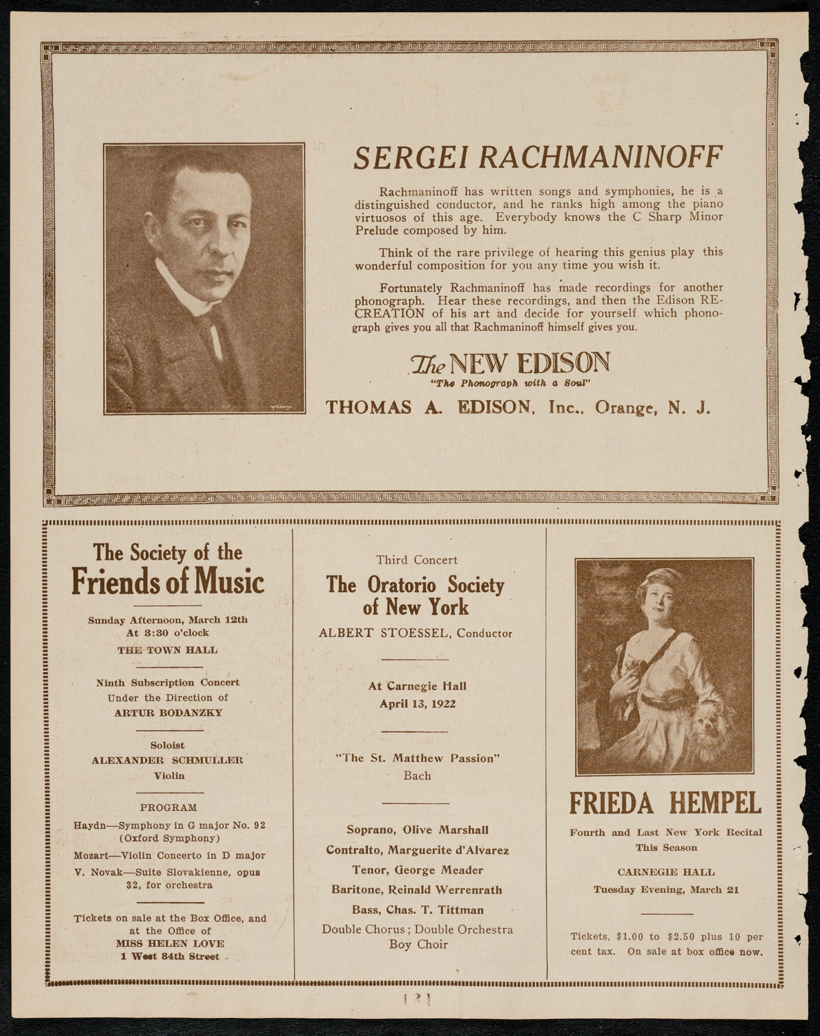 Conceptually similarMishel Piastro, Violin, and Joseph Press, Cello, March 5, 1922, program page 12 Mishel Piastro, Violin, and Joseph Press, Cello, March 5, 1922, program page 9 Mishel Piastro, Violin, and Joseph Press, Cello, March 5, 1922, program page 4 Mishel Piastro, Violin, and Joseph Press, Cello, March 5, 1922, program page 8 Mishel Piastro, Violin, and Joseph Press, Cello, March 5, 1922, program page 5 Mishel Piastro, Violin, and Joseph Press, Cello, March 5, 1922, program page 6 Mishel Piastro, Violin, and Joseph Press, Cello, March 5, 1922, program page 11 Mishel Piastro, Violin, and Joseph Press, Cello, March 5, 1922, program page 3 Mishel Piastro, Violin, and Joseph Press, Cello, March 5, 1922, program page 1 View MoreYour right to access the Digital Collections is subject to these Terms and Conditions.CH1164699 Mishel Piastro, Violin, and Joseph Press, Cello, March 5, 1922, program page 2CONTENT TYPE: program pageSEASON: 1921-1922Date: March 5, 1922 YEAR: 1922 Credit: Courtesy of Carnegie Hall Archives Source name: Carnegie Hall Rose ArchivesDepartment: Rose Museum and ArchivesCollection: Programs CollectionPlace: New York, NY LANGUAGE: English Size: 3743px × 4727px (~50 MB) RIGHTS STATEMENT: NO COPYRIGHT - UNITED STATESCarnegie Hall believes that this item is in the public domain under the laws of the United States, but a determination was not made as to its copyright status under the copyright laws of other countries. The item may not be in the public domain under the laws of other countries. Read full Rights StatementThough not required, if you want to credit us as the source, please use the statement "Courtesy of Carnegie Hall Rose Archives" and provide a link back to the item on our Digital Collections site. Doing so helps us track how our collection is used and helps justify freely releasing even more content in the future. Sunday, March 5, 1922 at 8:15PM SEASON: 1921-1922VENUE: Main HallDownloadRelated materials: View MorePDFComplete program of Mishel Piastro and Joseph Press, March 5, 1922 Mishel Piastro, Violin, and Joseph Press, Cello, March 5, 1922, program page 12 Mishel Piastro, Violin, and Joseph Press, Cello, March 5, 1922, program page 11 Mishel Piastro, Violin, and Joseph Press, Cello, March 5, 1922, program page 10 Mishel Piastro, Violin, and Joseph Press, Cello, March 5, 1922, program page 9 Mishel Piastro, Violin, and Joseph Press, Cello, March 5, 1922, program page 8 RELATED: Carnegie Hall Programs