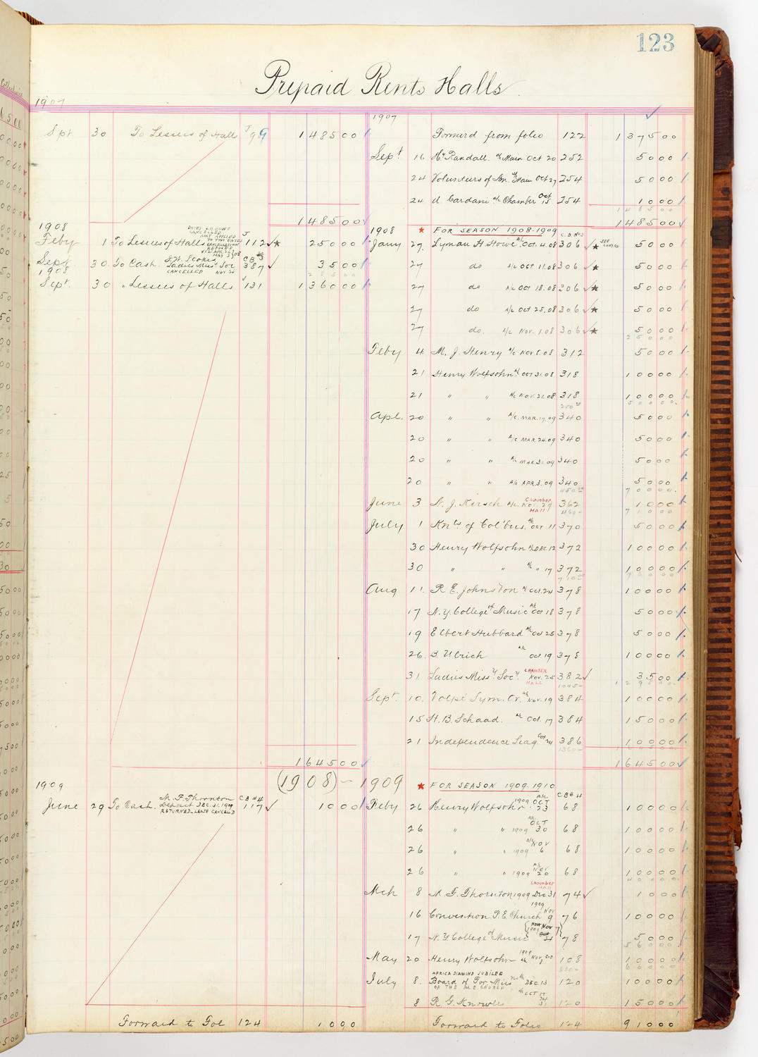 Conceptually similarMusic Hall Accounting Ledger, volume 3, page 320 Music Hall Accounting Ledger, volume 3, page 21 Music Hall Accounting Ledger, volume 3, page 33 Music Hall Accounting Ledger, volume 3, page 39 Music Hall Accounting Ledger, volume 3, page 131 Music Hall Accounting Ledger, volume 3, page 333 Music Hall Accounting Ledger, volume 3, page 130 Music Hall Accounting Ledger, volume 3, page 207 Music Hall Accounting Ledger, volume 3, page 258 View MoreYour right to access the Digital Collections is subject to these Terms and Conditions.CH1689756 Music Hall Accounting Ledger, volume 3, page 123CONTENT TYPE: accounting ledger pageNames: Music Hall Company of New York, Ltd.Date: 1907-1909 Credit: From The New York Public Library / Courtesy of Carnegie Hall Archives. Source name: Carnegie Hall Rose ArchivesDepartment: Rose Museum and ArchivesCollection: Music Hall Company of New York Accounting Ledger CollectionPlace: New York, NY LANGUAGE: English Size: 6685px × 9316px (~178 MB) RIGHTS STATEMENT: NO COPYRIGHT - UNITED STATESCarnegie Hall believes that this item is in the public domain under the laws of the United States, but a determination was not made as to its copyright status under the copyright laws of other countries. The item may not be in the public domain under the laws of other countries. Read full Rights StatementThough not required, if you want to credit us as the source, please use the statement "Courtesy of Carnegie Hall Rose Archives" and provide a link back to the item on our Digital Collections site. Doing so helps us track how our collection is used and helps justify freely releasing even more content in the future. DownloadRelated materials: View MorePDFThe Music Hall Company of N.Y. Accounting Ledger: Volume 3, 1898-1909 Music Hall Accounting Ledger, volume 3, spine Music Hall Accounting Ledger, volume 3, inside back cover page 2 Music Hall Accounting Ledger, volume 3, inside back cover page 1 Music Hall Accounting Ledger, volume 3, back cover Music Hall Accounting Ledger, volume 3, back endpaper 2 RELATED: Music Hall Company of New York Accounting Ledgers