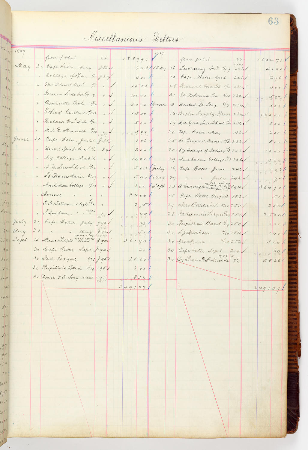 Conceptually similarMusic Hall Accounting Ledger, volume 3, page 218 Music Hall Accounting Ledger, volume 3, page 241 Music Hall Accounting Ledger, volume 3, page 239 Music Hall Accounting Ledger, volume 3, page 261 Music Hall Accounting Ledger, volume 3, page 67 Music Hall Accounting Ledger, volume 3, page 137 Music Hall Accounting Ledger, volume 3, page 177 Music Hall Accounting Ledger, volume 3, page 155 Music Hall Accounting Ledger, volume 3, page 174 View MoreYour right to access the Digital Collections is subject to these Terms and Conditions.CH1689703 Music Hall Accounting Ledger, volume 3, page 63CONTENT TYPE: accounting ledger pageNames: Music Hall Company of New York, Ltd.Date: May - September, 1907 YEAR: 1907 Credit: From The New York Public Library / Courtesy of Carnegie Hall Archives. Source name: Carnegie Hall Rose ArchivesDepartment: Rose Museum and ArchivesCollection: Music Hall Company of New York Accounting Ledger CollectionPlace: New York, NY LANGUAGE: English Size: 6392px × 9335px (~170 MB) RIGHTS STATEMENT: NO COPYRIGHT - UNITED STATESCarnegie Hall believes that this item is in the public domain under the laws of the United States, but a determination was not made as to its copyright status under the copyright laws of other countries. The item may not be in the public domain under the laws of other countries. Read full Rights StatementThough not required, if you want to credit us as the source, please use the statement "Courtesy of Carnegie Hall Rose Archives" and provide a link back to the item on our Digital Collections site. Doing so helps us track how our collection is used and helps justify freely releasing even more content in the future. DownloadRelated materials: View MorePDFThe Music Hall Company of N.Y. Accounting Ledger: Volume 3, 1898-1909 Music Hall Accounting Ledger, volume 3, spine Music Hall Accounting Ledger, volume 3, inside back cover page 2 Music Hall Accounting Ledger, volume 3, inside back cover page 1 Music Hall Accounting Ledger, volume 3, back cover Music Hall Accounting Ledger, volume 3, back endpaper 2 RELATED: Music Hall Company of New York Accounting Ledgers