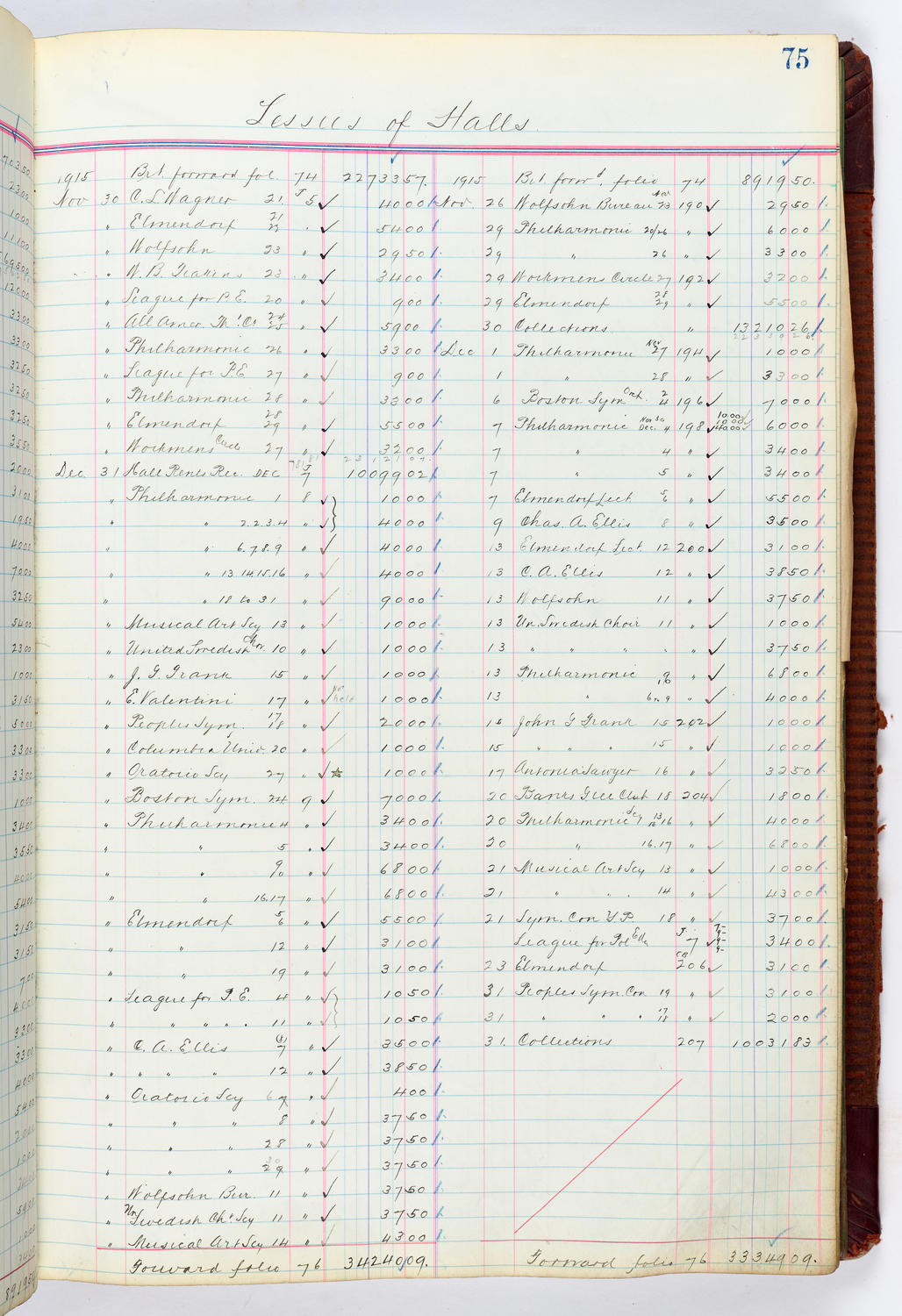 Conceptually similarMusic Hall Accounting Ledger, volume 4, page 119 Music Hall Accounting Ledger, volume 4, page 118 Music Hall Accounting Ledger, volume 4, page 68 Music Hall Accounting Ledger, volume 4, page 245 Music Hall Accounting Ledger, volume 4, page 261 Music Hall Accounting Ledger, volume 5, page 3 Music Hall Accounting Ledger, volume 4, page 76 Music Hall Accounting Ledger, volume 5, page 4 Music Hall Accounting Ledger, volume 4, page 74 View MoreYour right to access the Digital Collections is subject to these Terms and Conditions.CH1690177 Music Hall Accounting Ledger, volume 4, page 75CONTENT TYPE: accounting ledger pageNames: Music Hall Company of New York, Ltd.SEASON: 1915-1916Date: November - December, 1915 YEAR: 1915 Credit: From The New York Public Library / Courtesy of Carnegie Hall Archives. Source name: Carnegie Hall Rose ArchivesDepartment: Rose Museum and ArchivesCollection: Music Hall Company of New York Accounting Ledger CollectionPlace: New York, NY LANGUAGE: English Size: 6457px × 9425px (~174 MB) RIGHTS STATEMENT: NO COPYRIGHT - UNITED STATESCarnegie Hall believes that this item is in the public domain under the laws of the United States, but a determination was not made as to its copyright status under the copyright laws of other countries. The item may not be in the public domain under the laws of other countries. Read full Rights StatementThough not required, if you want to credit us as the source, please use the statement "Courtesy of Carnegie Hall Rose Archives" and provide a link back to the item on our Digital Collections site. Doing so helps us track how our collection is used and helps justify freely releasing even more content in the future. DownloadRelated materials: View MorePDFThe Music Hall Company of N.Y. Accounting Ledger: Volume 4, 1914-1922 Music Hall Accounting Ledger, volume 4, spine Music Hall Accounting Ledger, volume 4, page 376 Music Hall Accounting Ledger, volume 4, page 374 Music Hall Accounting Ledger, volume 4, page 354 Music Hall Accounting Ledger, volume 4, back endpage 2 RELATED: Music Hall Company of New York Accounting Ledgers