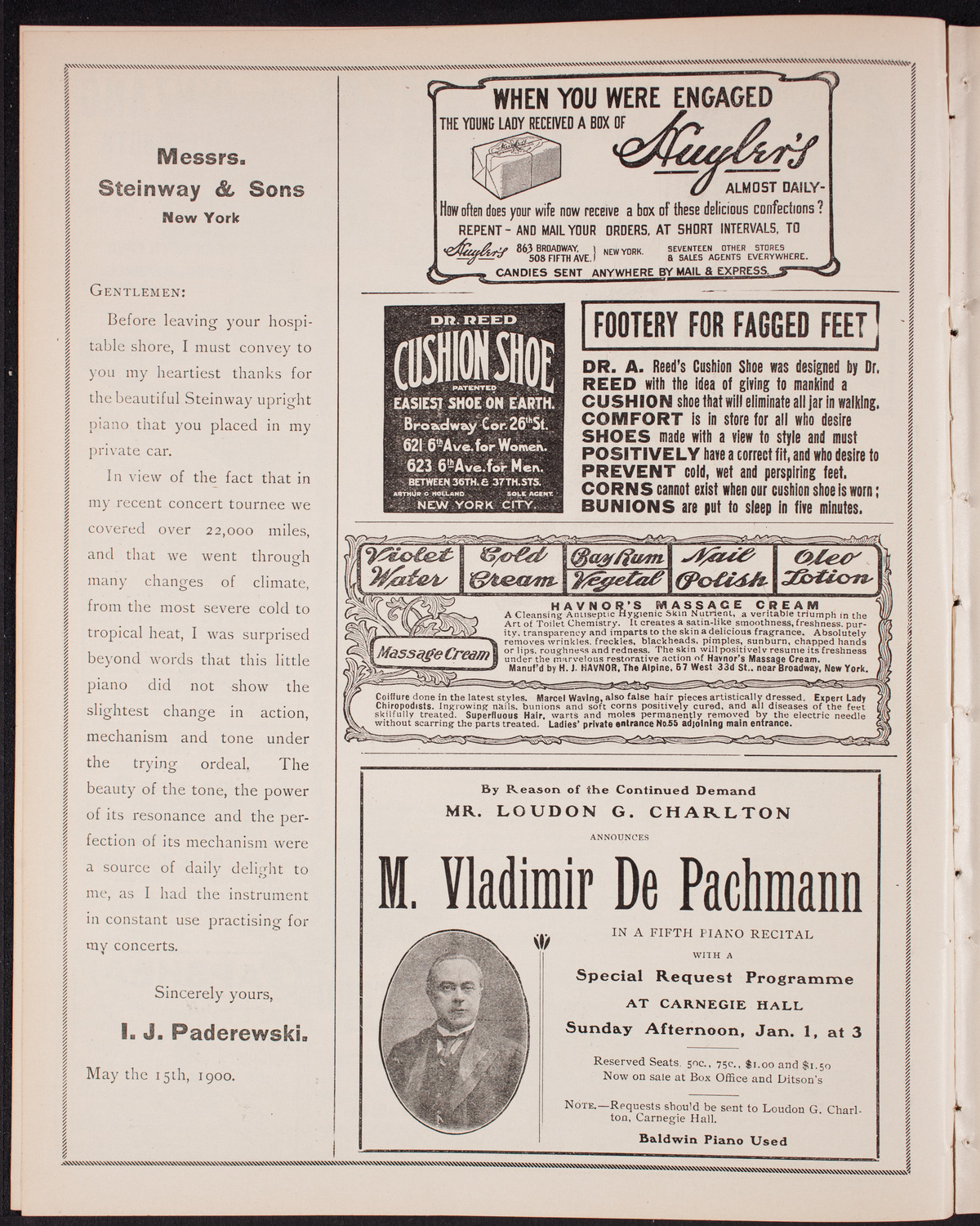 Conceptually similarNew York Philharmonic, December 17, 1904, program page 1 New York Philharmonic, December 17, 1904, program page 7 New York Philharmonic, December 17, 1904, program page 5 New York Philharmonic, December 3, 1904, program page 4 New York Philharmonic, December 17, 1904, program page 8 New York Philharmonic, December 17, 1904, program page 10 New York Philharmonic, December 17, 1904, program page 13 New York Philharmonic, December 17, 1904, program page 9 New York Philharmonic, December 17, 1904, program page 11 View MoreYour right to access the Digital Collections is subject to these Terms and Conditions.CH193732 New York Philharmonic, December 17, 1904, program page 4CONTENT TYPE: program pageSEASON: 1904-1905Date: December 17, 1904 YEAR: 1904 Credit: Courtesy of Carnegie Hall Archives Source name: Carnegie Hall Rose ArchivesDepartment: Rose Museum and ArchivesCollection: Programs CollectionPlace: New York, NY LANGUAGE: English Size: 3701px × 4628px (~49 MB) RIGHTS STATEMENT: NO COPYRIGHT - UNITED STATESCarnegie Hall believes that this item is in the public domain under the laws of the United States, but a determination was not made as to its copyright status under the copyright laws of other countries. The item may not be in the public domain under the laws of other countries. Read full Rights StatementThough not required, if you want to credit us as the source, please use the statement "Courtesy of Carnegie Hall Rose Archives" and provide a link back to the item on our Digital Collections site. Doing so helps us track how our collection is used and helps justify freely releasing even more content in the future. Saturday, December 17, 1904 at 8:15PM SEASON: 1904-1905VENUE: Main HallDownloadRelated materials: View MorePDFComplete program of New York Philharmonic, December 17, 1904 New York Philharmonic, December 17, 1904, program page 14 New York Philharmonic, December 17, 1904, program page 13 New York Philharmonic, December 17, 1904, program page 12 New York Philharmonic, December 17, 1904, program page 11 New York Philharmonic, December 17, 1904, program page 10 RELATED: Carnegie Hall Programs