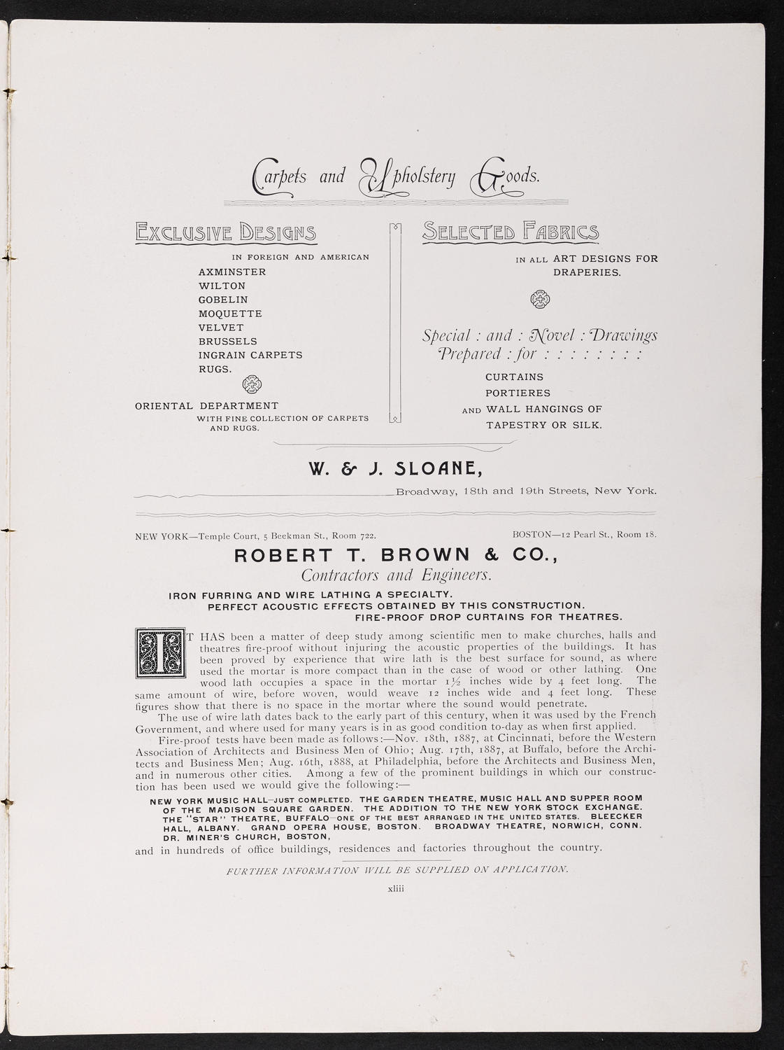 Conceptually similarOpening Week Music Festival: Opening Night of Carnegie Hall, May 5, 1891, souvenir program page 8 Opening Week Music Festival: Opening Night of Carnegie Hall, May 5, 1891, souvenir program page 59 Opening Week Music Festival: Opening Night of Carnegie Hall, May 5, 1891, souvenir program page 62 Opening Week Music Festival: Opening Night of Carnegie Hall, May 5, 1891, souvenir program page 53 Opening Week Music Festival: Opening Night of Carnegie Hall, May 5, 1891, souvenir program page 20 Opening Week Music Festival: Opening Night of Carnegie Hall, May 5, 1891, souvenir program page 14 Opening Week Music Festival: Opening Night of Carnegie Hall, May 5, 1891, souvenir program page 60 Opening Week Music Festival: Opening Night of Carnegie Hall, May 5, 1891, souvenir program page 7 Opening Week Music Festival: Opening Night of Carnegie Hall, May 5, 1891, souvenir program page 16 View MoreYour right to access the Digital Collections is subject to these Terms and Conditions.CH1644517 Opening Week Music Festival: Opening Night of Carnegie Hall, May 5, 1891, souvenir program page 54CONTENT TYPE: souvenir program pageSEASON: 1890-1891Date: May 5, 1891 May 5 - 9, 1891 YEAR: 1891 VENUE: Main HallCredit: Carnegie Hall Archives Source name: Carnegie Hall Rose ArchivesDepartment: Rose Museum and ArchivesCollection: Souvenir Programs CollectionPlace: New York, NY LANGUAGE: English Size: 3976px × 5320px (~60 MB) Archives Unique ID: CHA-SP-00128 DownloadRelated materials: View MorePDFComplete program of Opening Week Music Festival: Opening Night of Carnegie Hall, May 5, 1891 PDFComplete program notes of Opening Week Music Festival: Opening Night of Carnegie Hall, May 5, 1891 PDFComplete souvenir program of Opening Week Music Festival: Opening Night of Carnegie Hall, May 5, 1891 Ticket for opening night of the Music Hall, May 5, 1891 (back) Ticket for opening night of the Music Hall, May 5, 1891 (front) Opening Week Music Festival: Opening Night of Carnegie Hall, May 5, 1891, souvenir program page 51