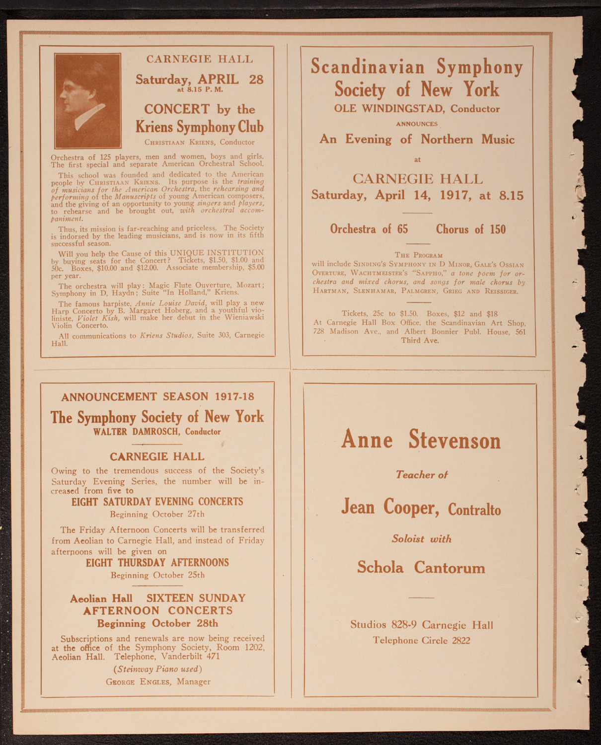Conceptually similarOratorio Society of New York, April 5, 1917, program page 4 Oratorio Society of New York, April 5, 1917, program page 2 Oratorio Society of New York, April 5, 1917, program page 3 Oratorio Society of New York, April 5, 1917, program page 5 Oratorio Society of New York, April 5, 1917, program page 7 Oratorio Society of New York, April 5, 1917, program page 6 Oratorio Society of New York, April 5, 1917, program page 1 Oratorio Society of New York, April 5, 1917, program page 9 Oratorio Society of New York, April 5, 1917, program page 10 View MoreYour right to access the Digital Collections is subject to these Terms and Conditions.CH1142687 Oratorio Society of New York, April 5, 1917, program page 8CONTENT TYPE: program pageSEASON: 1916-1917Date: April 5, 1917 YEAR: 1917 Credit: Courtesy of Carnegie Hall Archives Source name: Carnegie Hall Rose ArchivesDepartment: Rose Museum and ArchivesCollection: Programs CollectionPlace: New York, NY LANGUAGE: English Size: 3691px × 4575px (~48 MB) RIGHTS STATEMENT: NO COPYRIGHT - UNITED STATESCarnegie Hall believes that this item is in the public domain under the laws of the United States, but a determination was not made as to its copyright status under the copyright laws of other countries. The item may not be in the public domain under the laws of other countries. Read full Rights StatementThough not required, if you want to credit us as the source, please use the statement "Courtesy of Carnegie Hall Rose Archives" and provide a link back to the item on our Digital Collections site. Doing so helps us track how our collection is used and helps justify freely releasing even more content in the future. Thursday, April 5, 1917 at 8:15PM SEASON: 1916-1917VENUE: Main HallDownloadRelated materials: View MorePDFComplete program of Oratorio Society of New York, April 5, 1917 Oratorio Society of New York, April 5, 1917, program page 12 Oratorio Society of New York, April 5, 1917, program page 11 Oratorio Society of New York, April 5, 1917, program page 10 Oratorio Society of New York, April 5, 1917, program page 9 RELATED: Carnegie Hall Programs