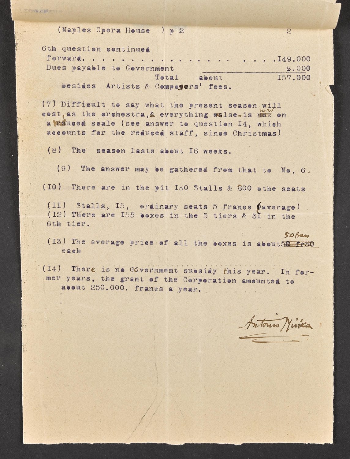 Conceptually similarQuestionnaire to Naples "San Carlo" Theater (translation), page 1 of 2 Questionnaire to Naples "San Carlo" Theater Questionnaire to Odessa City Theater (translation) Questionnaire to Hotel de Musique, page 2 of 2 Questionnaire to Teatro Comunale Questionnaire to Hotel de Musique, page 1 of 2 Questionnaire to Breslau Stadt Theater, February 1893 (translation) Questionnaire to Mannheim Grossherzoglichen Hof- und National-Theater Questionnaire to theaters of Leeds, 1893 (back) View MoreYour right to access the Digital Collections is subject to these Terms and Conditions.CH1566007 Questionnaire to Naples "San Carlo" Theater (translation), page 2 of 2Two typewritten pages with English translation of answers to questionnaire. CONTENT TYPE: correspondenceNames: William Burnet Tuthill (1855–1929)Date: Undated Credit: Courtesy of Carnegie Hall Archives Source name: Carnegie Hall Rose ArchivesDepartment: Rose Museum and ArchivesCollection: William B. Tuthill CollectionPlace: Naples LANGUAGE: English Size: 3954px × 5186px (~58 MB) Archives Unique ID: CHA-WBTC-Q-C026 RIGHTS STATEMENT: NO COPYRIGHT - UNITED STATESCarnegie Hall believes that this item is in the public domain under the laws of the United States, but a determination was not made as to its copyright status under the copyright laws of other countries. The item may not be in the public domain under the laws of other countries. Read full Rights StatementThough not required, if you want to credit us as the source, please use the statement "Courtesy of Carnegie Hall Rose Archives" and provide a link back to the item on our Digital Collections site. Doing so helps us track how our collection is used and helps justify freely releasing even more content in the future. DownloadRelated materials: View MoreQuestionnaire to Stadytheater, February 13, 1893 Questionnaire to Kaiserlich Koininglich Hof Operntheater Questionnaire to Venice "La Fenice," February 10, 1893 Incomplete table of opera houses Questionnaire to Politeama Rossetti, March 4, 1893, page 1 of 2 Questionnaire to Politeama Rossetti, March 4, 1893, page 2 of 2 RELATED: William B. Tuthill Collection