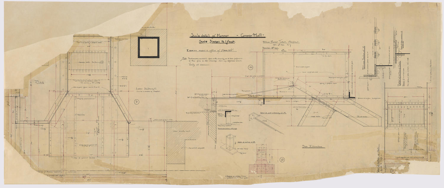 Conceptually similarReconstruction at coal-pockets; Scale details of service hopper and sliding doors, December 15, 1917 Scale details of granite work, June 27, 1917 Large scale detail of upper platform, July 25, 1917 Scale detail of rail at north end of corridor, August 1, 1917 Scale detail of sidewalk gratings, May 21, 1917 Alteration of doors on 7th Avenue: Scale detail of iron work at Door 1, July 3, 1917 Finishing details of south stairs in west corridor, August 13, 1917 Alteration of 7th Avenue doors: Diagram of existing framing, July 4, 1917 Final plan at sidewalk grating, February 1, 1918 View MoreYour right to access the Digital Collections is subject to these Terms and Conditions.CH1499700 Scale detail of hopper, December 28, 1917CONTENT TYPE: architectural drawings (visual works)Names: William Burnet Tuthill (1855–1929)SEASON: 1917-1918Date: December 28, 1917 YEAR: 1917 Credit: Courtesy of Carnegie Hall Archives Source name: Carnegie Hall Rose ArchivesDepartment: Rose Museum and ArchivesCollection: William B. Tuthill CollectionPlace: New York, NY LANGUAGE: English Size: 29382px × 12465px (~1047 MB) Archives Unique ID: CHA-AD-00011 RIGHTS STATEMENT: NO COPYRIGHT - UNITED STATESCarnegie Hall believes that this item is in the public domain under the laws of the United States, but a determination was not made as to its copyright status under the copyright laws of other countries. The item may not be in the public domain under the laws of other countries. Read full Rights StatementThough not required, if you want to credit us as the source, please use the statement "Courtesy of Carnegie Hall Rose Archives" and provide a link back to the item on our Digital Collections site. Doing so helps us track how our collection is used and helps justify freely releasing even more content in the future. DownloadRelated materials: View MorePlan of stage & Half plan above podium & Half plan below podium showing papier mache ornaments (with markings on front and back), 1912 Reinforcement #27 Triangle Mesh; American Steel Wire Alterations to 7th Avenue doors; Plan of oak jambs, soffits, etc. for 7th Avenue doors, July 26, 1917 Large scale detail of upper platform, July 25, 1917 Existing plan and construction at north doorway on 7th Avenue (Balcony exit), October 15, 1916 Scale detail of sidewalk gratings, May 21, 1917 RELATED: William B. Tuthill Collection