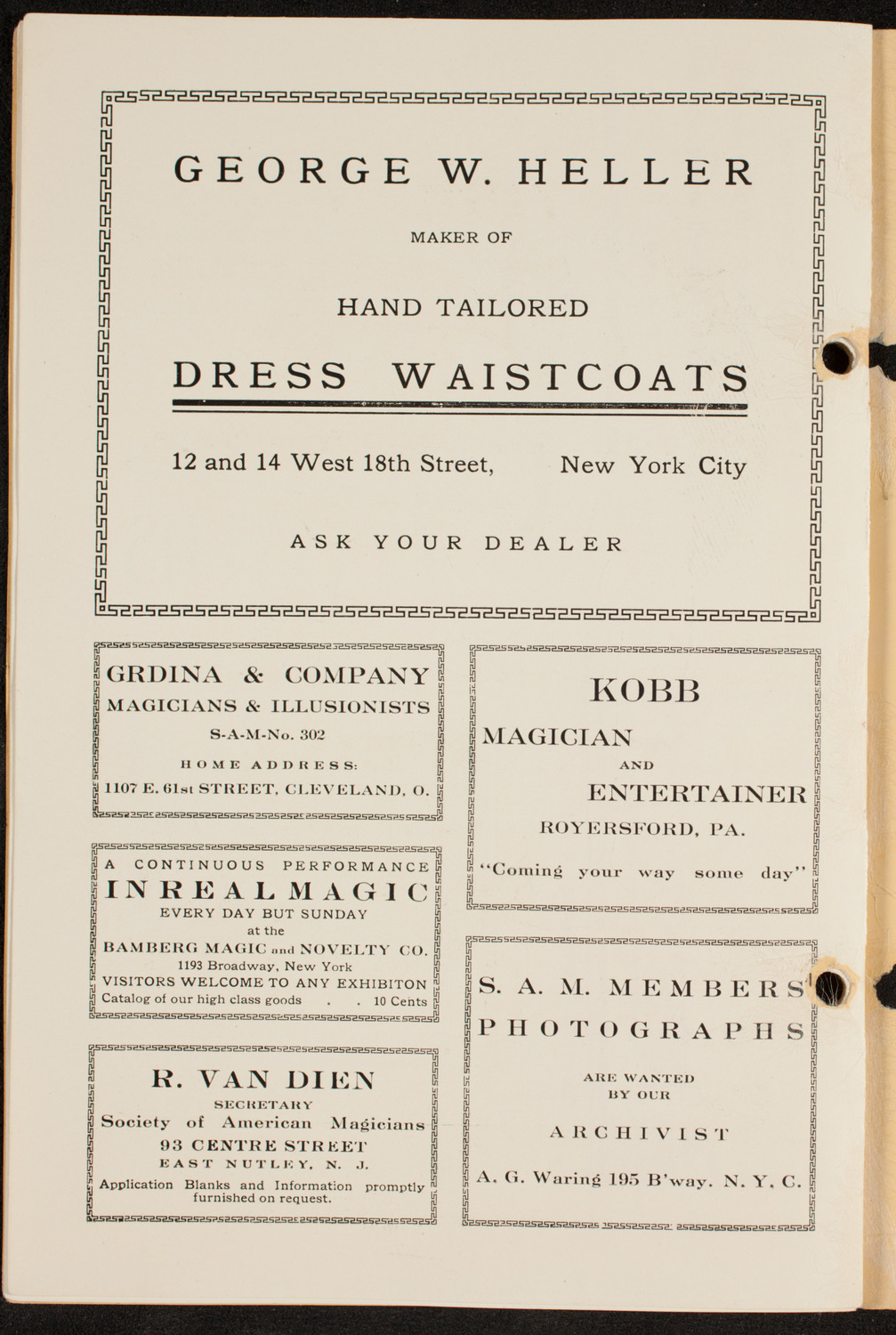 Conceptually similarSociety of American Magicians, March 26, 1912, program page 12 Society of American Magicians, March 26, 1912, program page 8 Society of American Magicians, March 26, 1912, program page 1 Society of American Magicians, March 26, 1912, program page 9 Society of American Magicians, March 26, 1912, program page 2 Society of American Magicians, March 26, 1912, program page 11 Society of American Magicians, March 26, 1912, program page 4 Society of American Magicians, March 26, 1912, program page 3 Society of American Magicians, March 26, 1912, program page 6 View MoreYour right to access the Digital Collections is subject to these Terms and Conditions.CH1130680 Society of American Magicians, March 26, 1912, program page 10No time listed in program for this event; stated time is approximate. CONTENT TYPE: program pageSEASON: 1911-1912Date: March 26, 1912 YEAR: 1912 Credit: Courtesy of Carnegie Hall Archives Source name: Carnegie Hall Rose ArchivesDepartment: Rose Museum and ArchivesCollection: Programs CollectionPlace: New York, NY LANGUAGE: English Size: 2299px × 3425px (~22 MB) RIGHTS STATEMENT: NO COPYRIGHT - UNITED STATESCarnegie Hall believes that this item is in the public domain under the laws of the United States, but a determination was not made as to its copyright status under the copyright laws of other countries. The item may not be in the public domain under the laws of other countries. Read full Rights StatementThough not required, if you want to credit us as the source, please use the statement "Courtesy of Carnegie Hall Rose Archives" and provide a link back to the item on our Digital Collections site. Doing so helps us track how our collection is used and helps justify freely releasing even more content in the future. Tuesday, March 26, 1912 at 8:00PM SEASON: 1911-1912VENUE: Carnegie LyceumDownloadRelated materials: View MorePDFComplete program of Society of American Magicians, March 26, 1912 Society of American Magicians, March 26, 1912, program page 12 Society of American Magicians, March 26, 1912, program page 11 Society of American Magicians, March 26, 1912, program page 9 Society of American Magicians, March 26, 1912, program page 8 RELATED: Carnegie Hall Programs