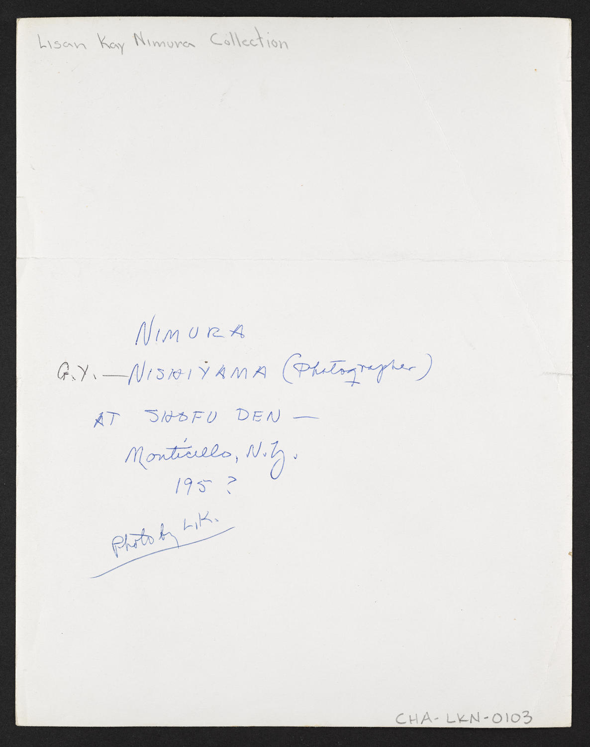 Conceptually similarYeichi Nimura, c. 1950s Yeichi Nimura in "Danse Javanesque," c. 1933 (back) Yeichi Nimura with his cat Ramas, c. 1944 (back) Yeichi Nimura in "Spear Episode," 1928-1930 (back) Yeichi Nimura, 1948 (back) Yeichi Nimura and Lisan Kay in Cairo, 1936 (back) Yeichi Nimura and Lisan Kay with singers and cats in Ballet Arts, Carnegie Hall Studio #60, c. 1940s (back) Yeichi Nimura in "Danse Javanesque," c. 1933 Yeichi Nimura with the Magyars in Budapest (back) View MoreYour right to access the Digital Collections is subject to these Terms and Conditions.CH1537970 Yeichi Nimura, c. 1950s (back)Caption on back: "Nimura / G.Y. - Nishiyama (photographer) / At Shofu Den - / Monticello, N.Y. / 195? / Photo by L.K." CONTENT TYPE: photographNames: Yeichi Nimura (1897–1979)Date: c. 1950s Credit: Courtesy of Carnegie Hall Archives Source name: Carnegie Hall Rose ArchivesDepartment: Rose Museum and ArchivesCollection: Lisan Kay Nimura CollectionPlace: Monticello, NY LANGUAGE: English Size: 5409px × 6839px (~105 MB) Archives Unique ID: CHA-LKN-0103 RIGHTS STATEMENT: IN COPYRIGHT - RIGHTS-HOLDER(S) UNLOCATABLE OR UNIDENTIFIABLECarnegie Hall reasonably believes that the underlying work represented in this item is in copyright, but no rightsholder has been identified or located.All materials made publicly available by Carnegie Hall are intended for archival research and educational use only. Users are responsible for determining the copyright status and securing any necessary permissions for other uses.The use of this material is not intended for commercial use.Read full Rights Statement: https://rightsstatements.org/vocab/InC-RUU/1.0/ DownloadRelated materials: View MoreMeeting of the Ballet Club at Ballet Arts, Carnegie Hall Studio #61 Meeting of Socrates Birsky's Ballet Club at Ballet Arts, Carnegie Hall Studio #61, c. 1960s (back) Meeting of the Ballet Club at Ballet Arts, Carnegie Hall Studio #61 (back) Meeting of Socrates Birsky's Ballet Club at Ballet Arts, Carnegie Hall Studio #61, c. 1960s Japan Ballet Letter by Lisan Kay Nimura, March 27, 1983 (back) Japan Ballet Letter by Lisan Kay Nimura, March 27, 1983 RELATED: Lisan Kay Nimura Collection